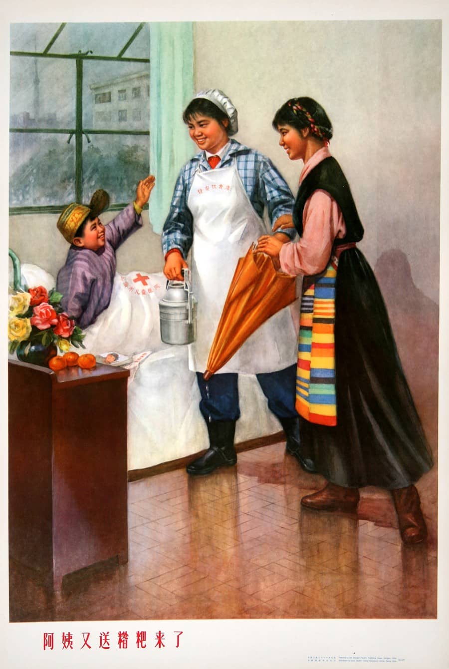 The poster beautifully exemplifies China's emphasis on unity and inclusivity among Han and ethnic minority populations. It captures a scene that portrays care and compassion across cultural boundaries. The act of delivering food to the young patient showcases a practical way in which the Han majority extends support to minority groups, fostering a sense of togetherness and understanding.