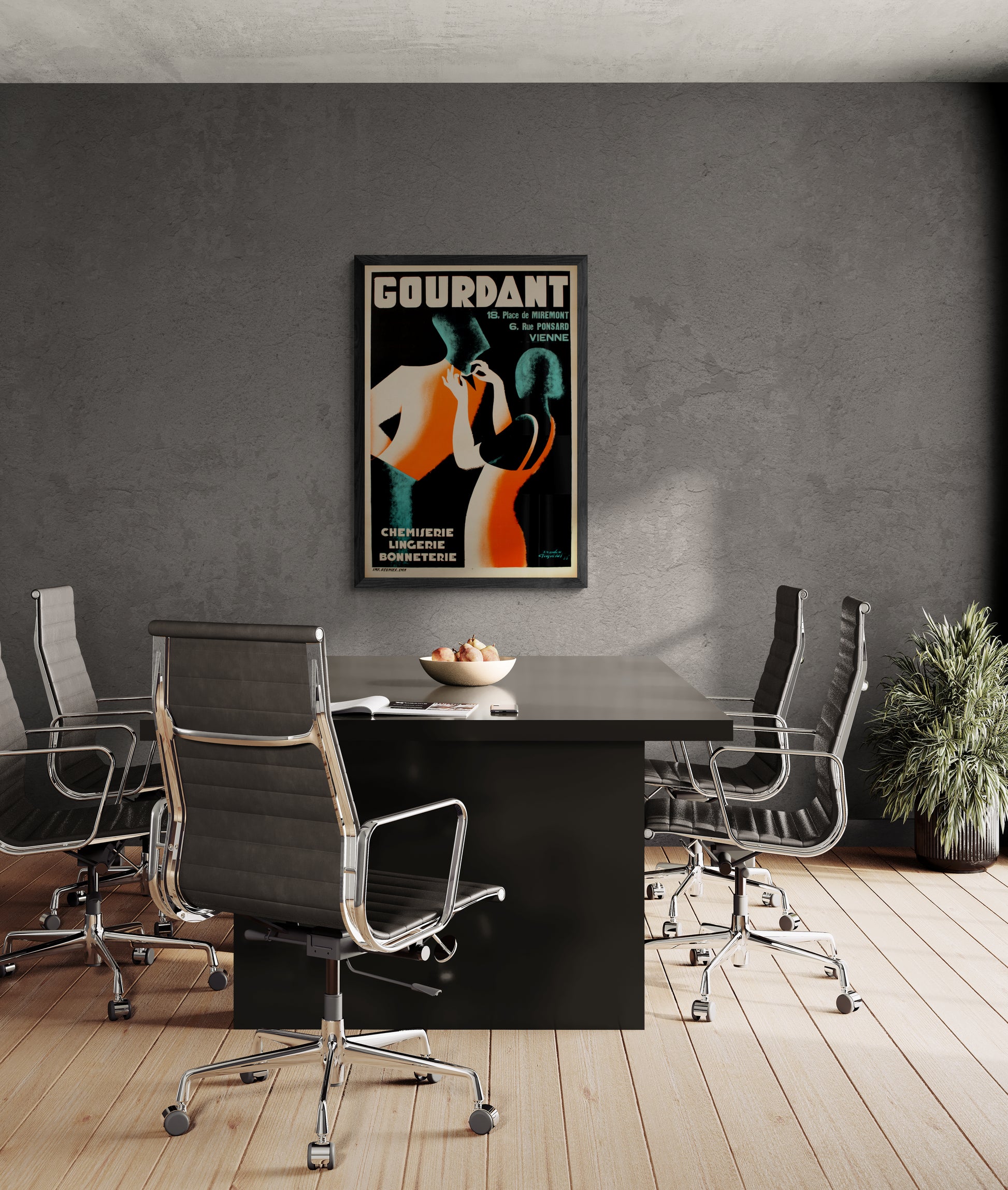 The intimacy of fixing someone’s tie is a wonderful motif for this poster for the Gourdant shop in Vienne, France. The store specialized in hosiery, lingerie, and underpinnings which helps to explain the sensual composition of a man and women getting ready for an evening out. It is a wonderful Art Deco image from 1933, with clear inspiration taken from Paul Colin. The artist is Doudou Frapotat, of which little is known more than his name.This is an Original Vintage Poster; it is not a reproduction. This poster is conservation mounted, linen backed, and in excellent condition. We guarantee the authenticity of all of our posters.