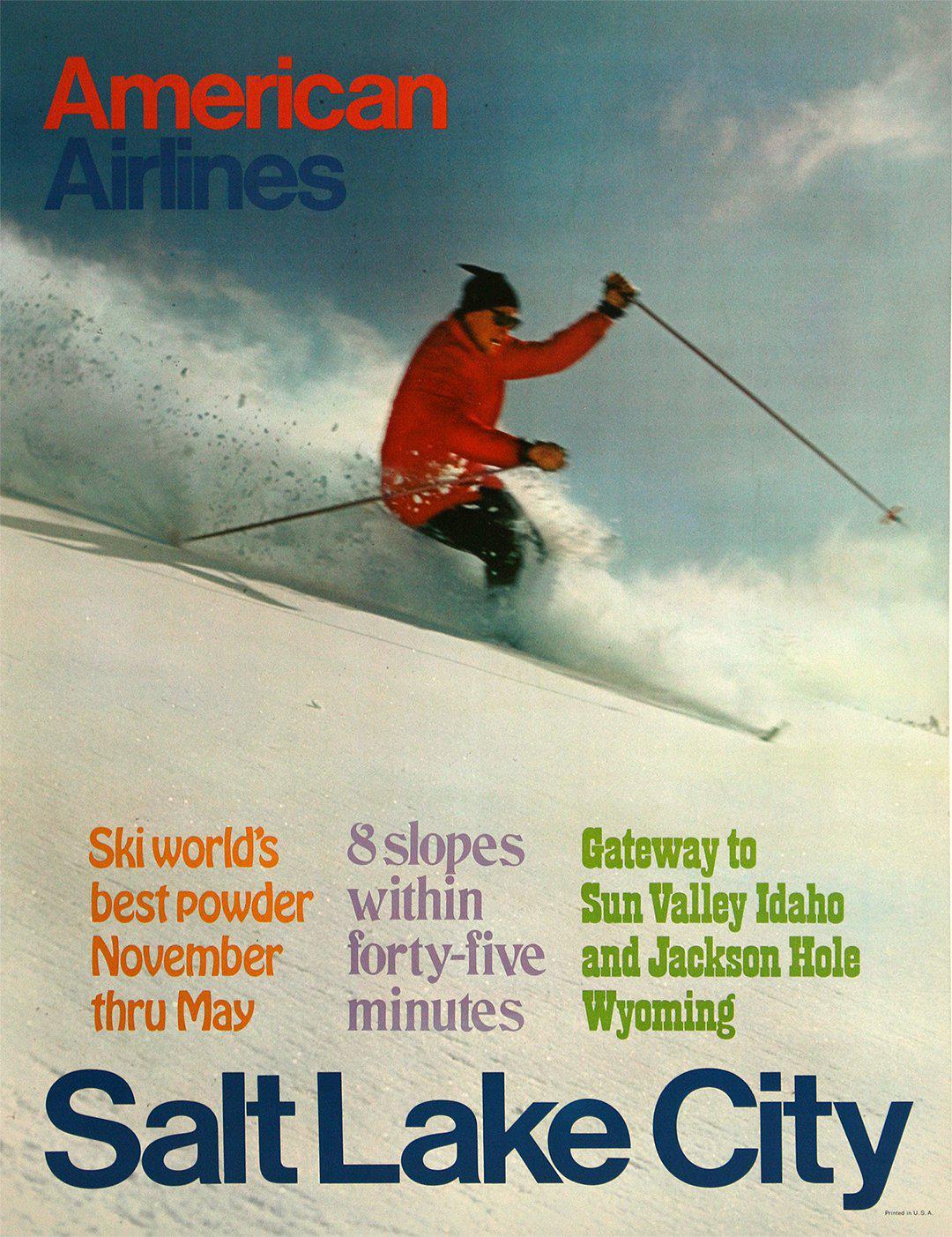 The perfect ski conditions of Salt Lake City, Utah is highlighted in this early 1970s poster created for American Airlines. A skier bobs down a mountain of fresh snow, and the texts lets us know that Utah is the best gateway to the even better ski areas of the United States.