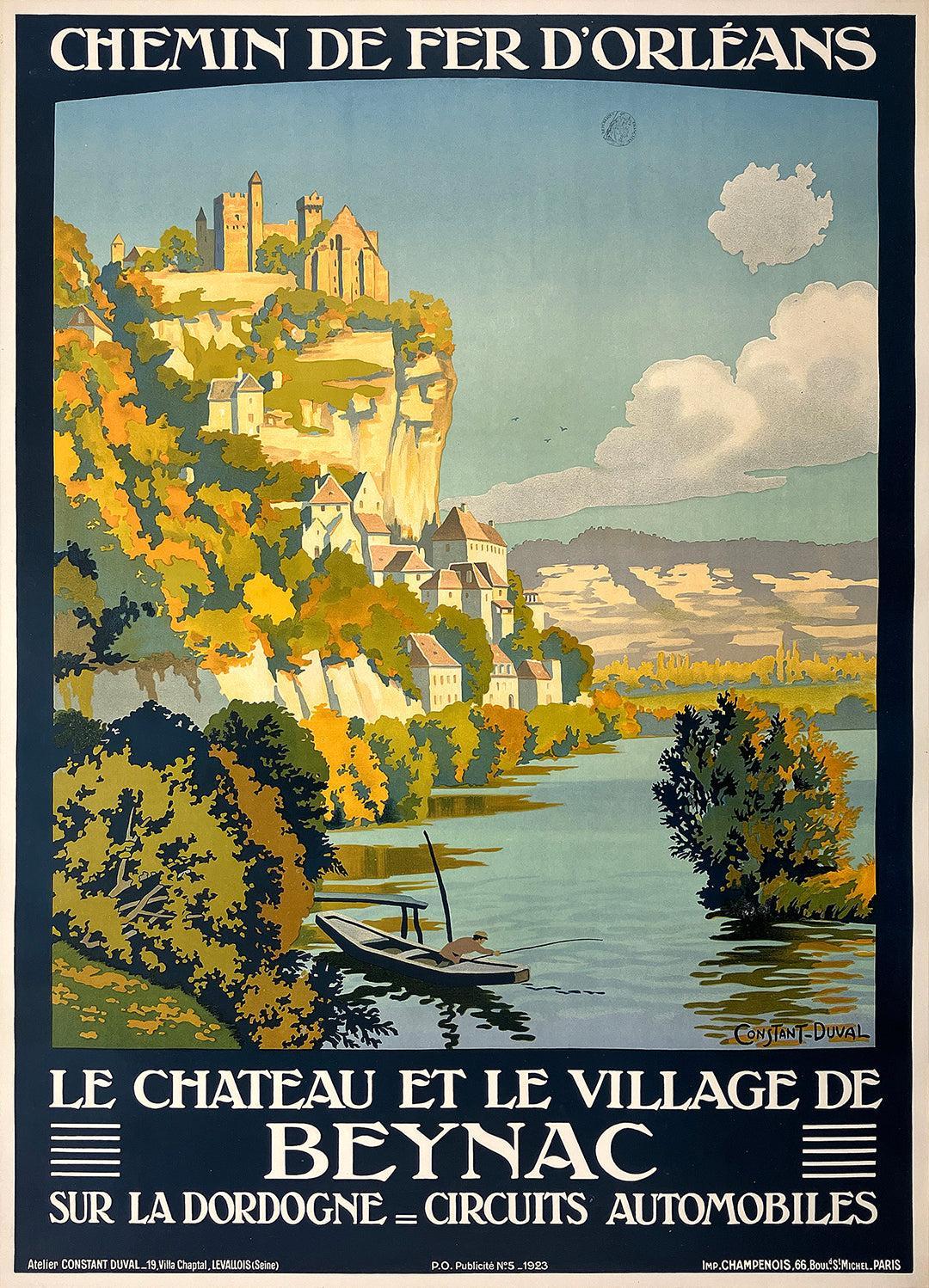 Commissioned by the Chemin de Fer d’Orléans, this poster promoted automobile excursions and rail travel to France’s lesser-explored regions. The Périgord Noir, where Beynac is located, was known for its preserved medieval towns, prehistoric sites, and natural beauty. The castle itself dates to the 12th century and was once a strategic stronghold in the Hundred Years’ War — its dramatic position above the river making it as defensible as it is picturesque.