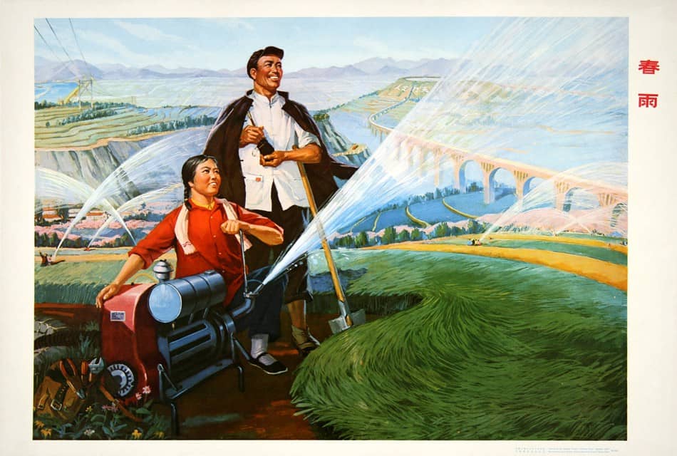 The poster "Spring Rain" portrays a scene of vibrant life and agricultural abundance in the midst of spring.