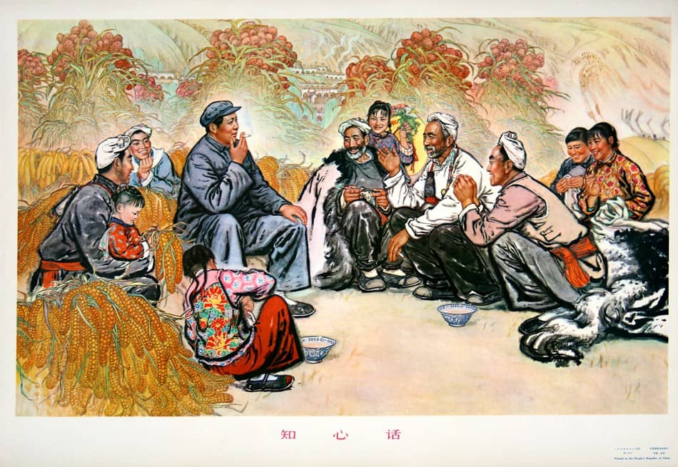 This is an original lithographic poster printed in China in the 1970's as part of Chairman Mao's Cultural Revolution. This is one of a large series of posters from that period in China . They were all very well drawn and printed and at all times display happy country people enjoying their lives under Chairman Mao. The title of this poster is Heart to Heart Talk featuring Chairman Mao.
