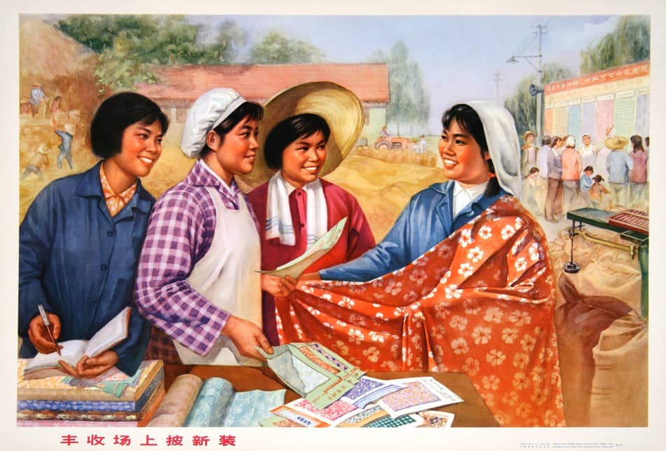 A temporary convenience store has been set up on the edge of the grain-drying field, showcasing an array of high-quality and fashionable fabrics. The assortment is comprehensive and diverse, capturing the attention of village's fashion-conscious young women and housewives. They gather around, carefully selecting their favorite floral patterns among the fabrics. This is the happiest time of the year for them – their diligent efforts have borne fruitful rewards. Each piece of vibrant and dazzling fabric brings a bright smile to their faces, as their hard work is reflected in their newfound prosperity.