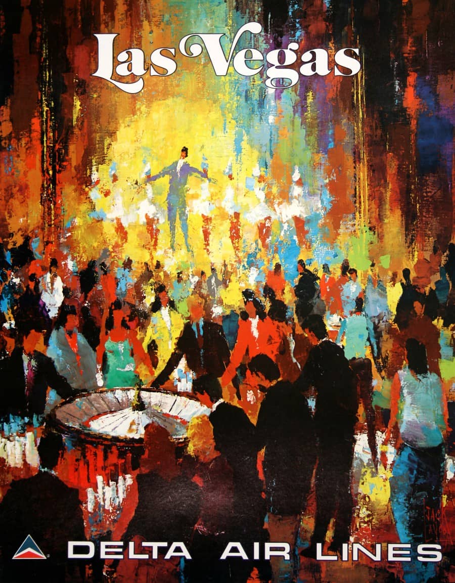 During the 1970s, there was an expansion of commercial air carriers and with it came a rush to promote destinations for each airline. Delta Air Lines commissioned Jack Laycox to design a group of travel posters in his style and with similar features to promote various domestic destinations. This poster shows a lively casino scene in Las Vegas.