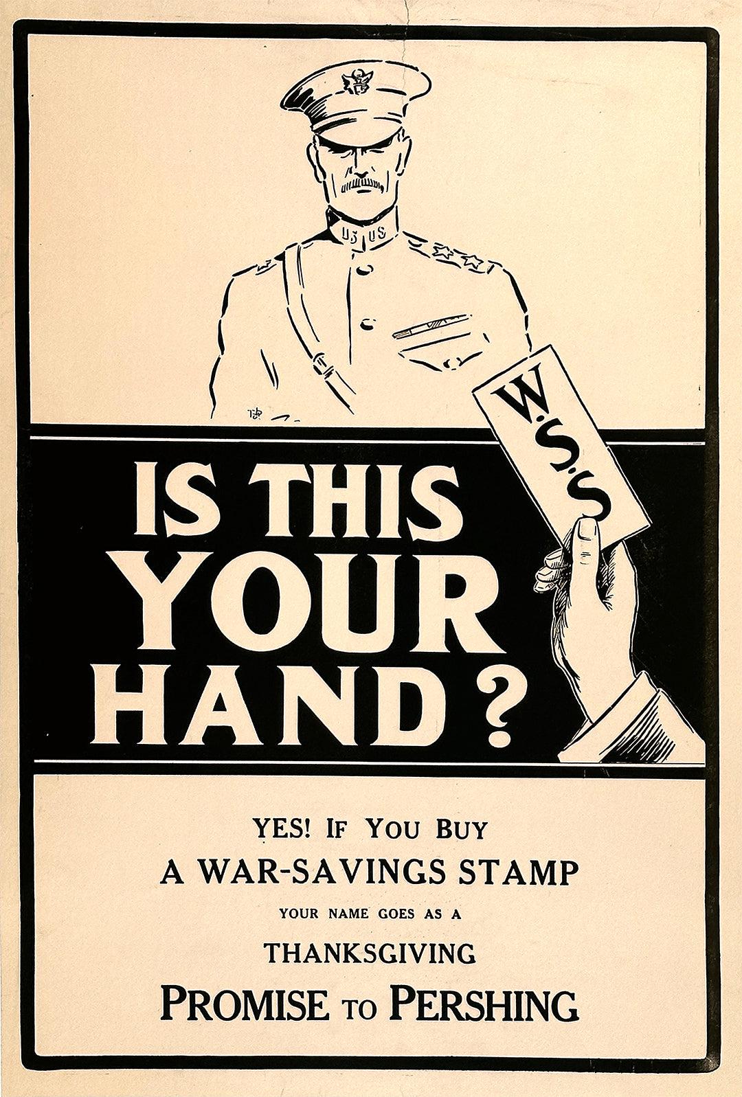 Important American general, John J. Pershing is relying on us in this WWI poster. By buying a War-Savings Stamp in time for Thanksgiving, we can help fund his efforts overseas and help turn the tide of battle.