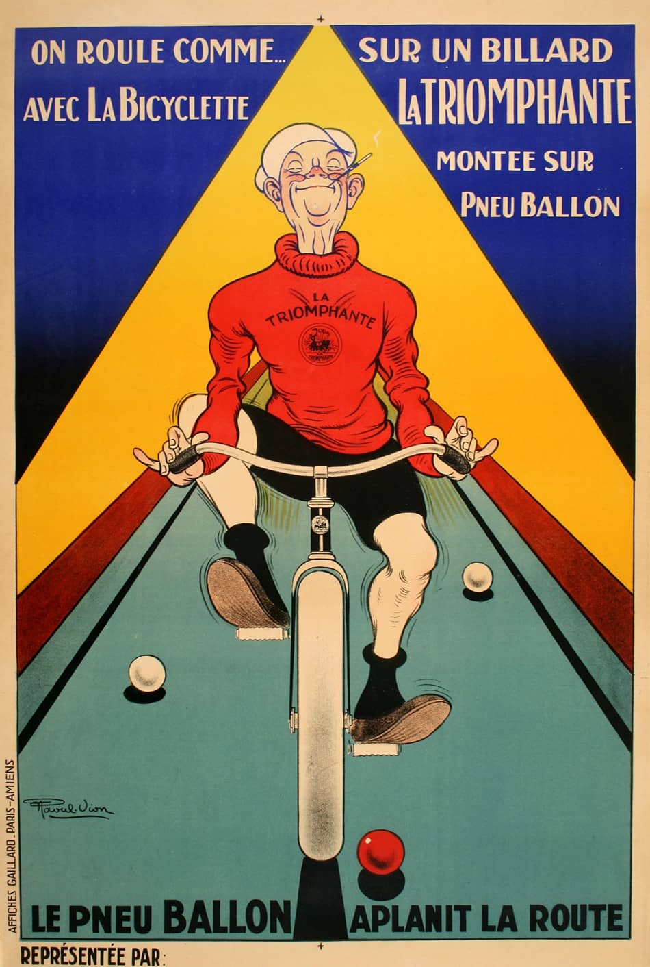 Gliding down the billiards table, smooth as felt! That's the message in this charming poster for Triomphante bicycle tires. This image was created at a time when bicycles were waning in influence, alongside the rise in automobiles in popularity. During this period, marketing shifted towards presenting cycling as a sport and pasttime and less of a mode of transportation. The tying together of the bicycle with the imagery of billiards was very much intentional in this design.