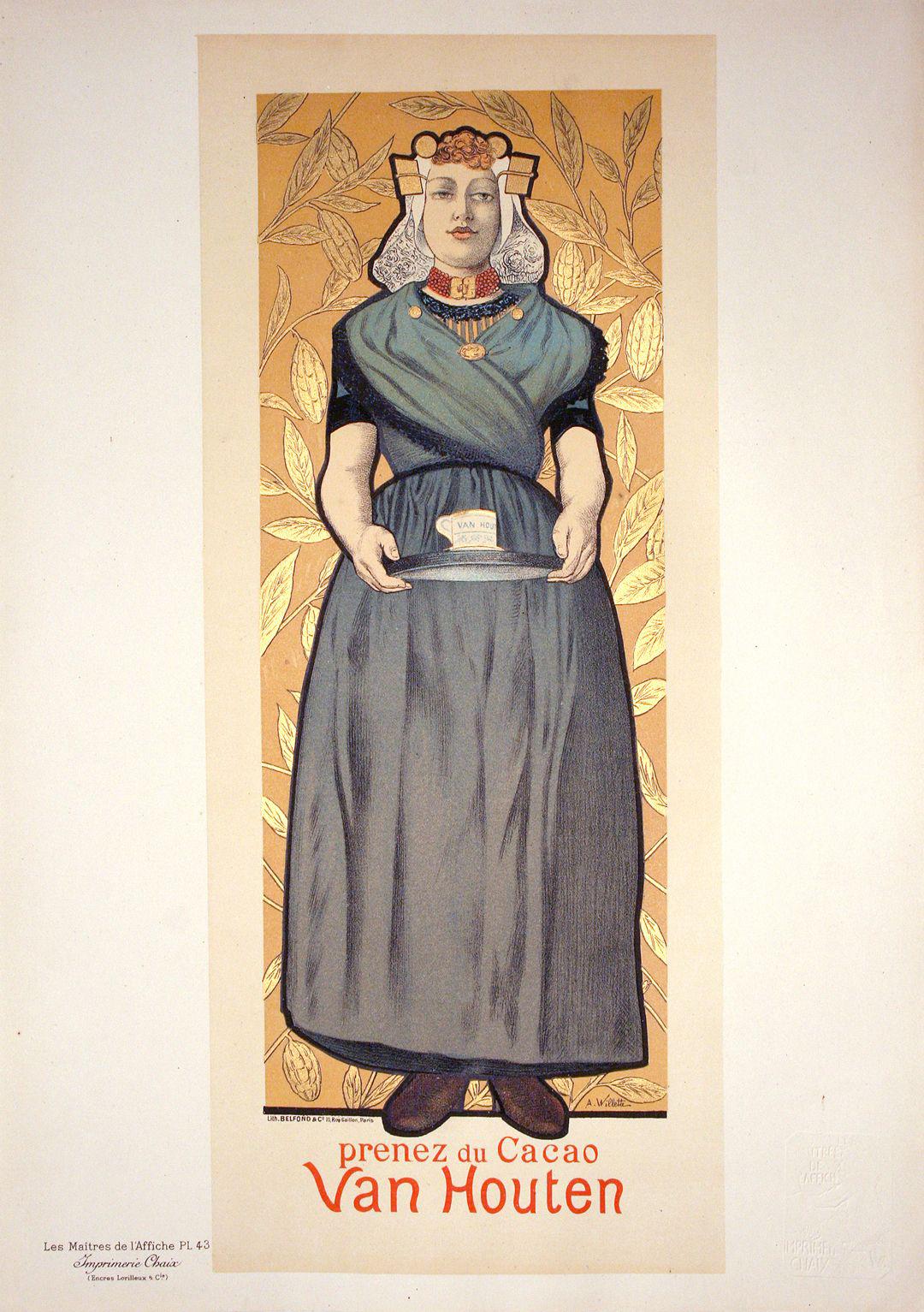 In this image, Adolph L. Willette (1857 – 1926) depicts a Dutch woman in traditional garb holding a try of Van Houten hot chocolate. Willette created the full-sized version of this vintage poster in 1893. Willette was a painter who successfully switched to illustration, caricatures and lithography in the 1880s. He was most well-known for his satirical illustrations in the humor magazines of his day.