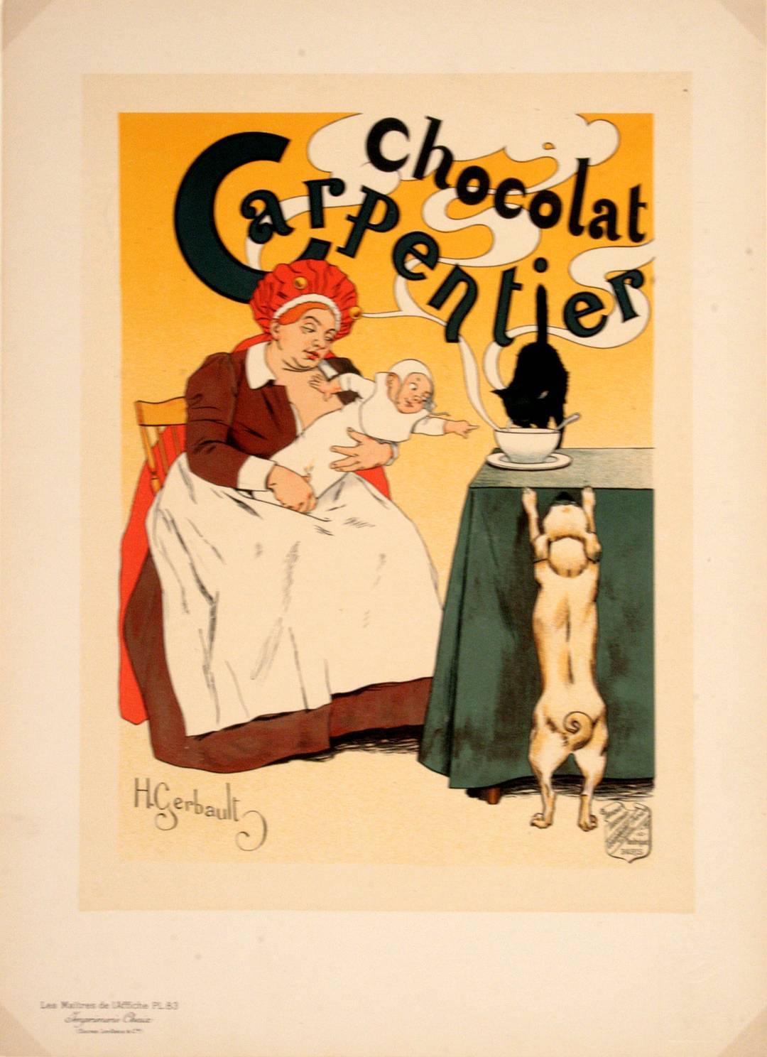 This poster advertises hot chocolate from the brand Chocolate Carpentier. Set in a yellow background, the focus of the image is on the steaming cup on the right-hand side of the advertisement. The baby is observed reaching away from his mother and towards the hot chocolate in the same manner that the white dog is stretched toward the table.