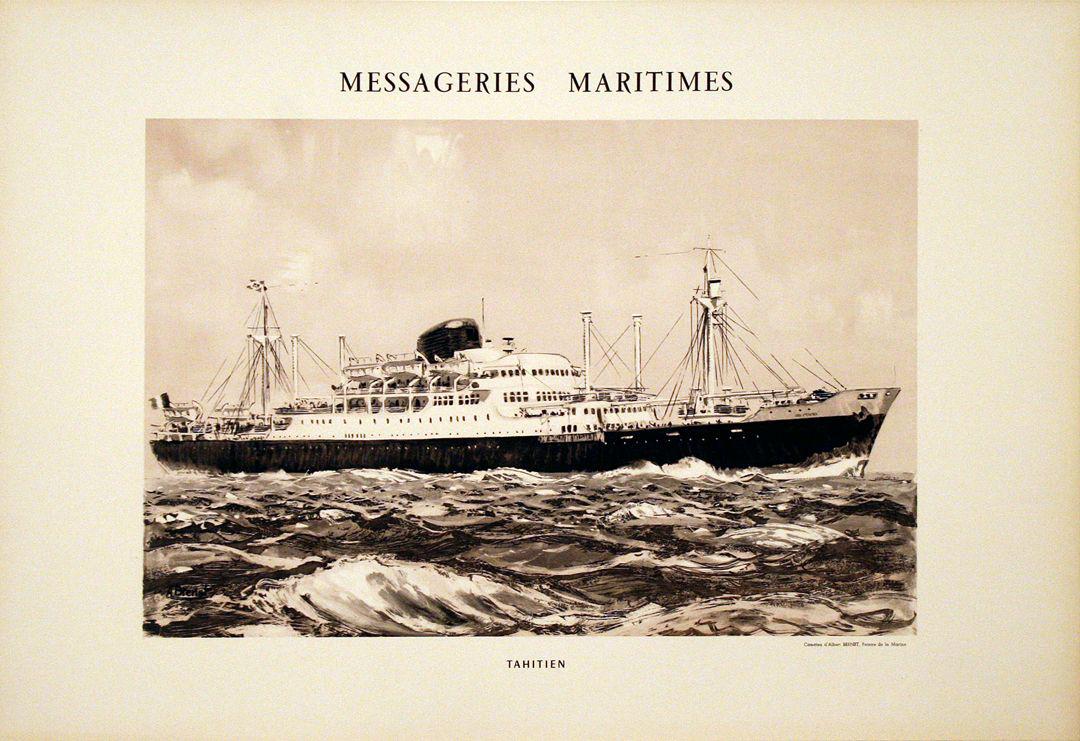 Messageries Maritimes was a French shipping line company that was founded in 1851. This poster by Albert Brenet boasts the superiority of Messageries Maritimes routes, specifically its Tahitien ship. The Tahitien carried passengers and military personnel to French outposts in the Caribbean and the Pacific. The round-trip journey took almost four months between Marseilles and Sydney. It was amongst the last of the real working cargo-passenger liners which were replaced by air travel as the 20th century progressed.
