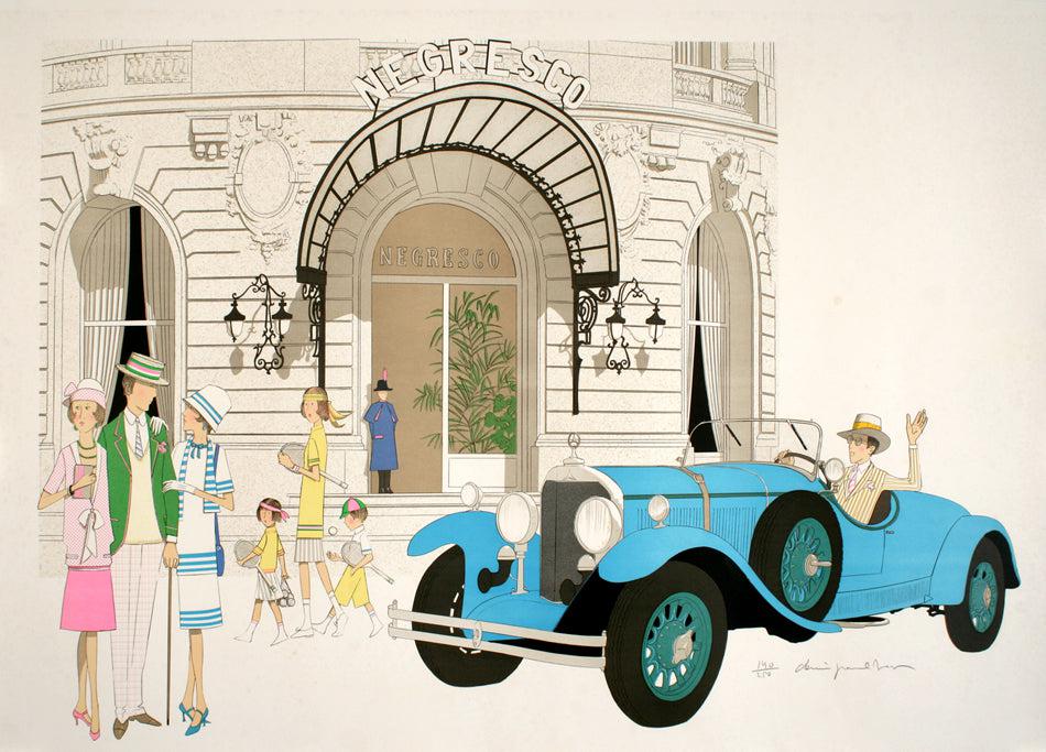 This vintage poster print is part of a series of images Denis Paul Noyer created that feature famous hotels and vintage luxury cars. This print depicts a classic car in front of the Hotel Negresco in Nice. It is hand signed by Noyer in pencil.