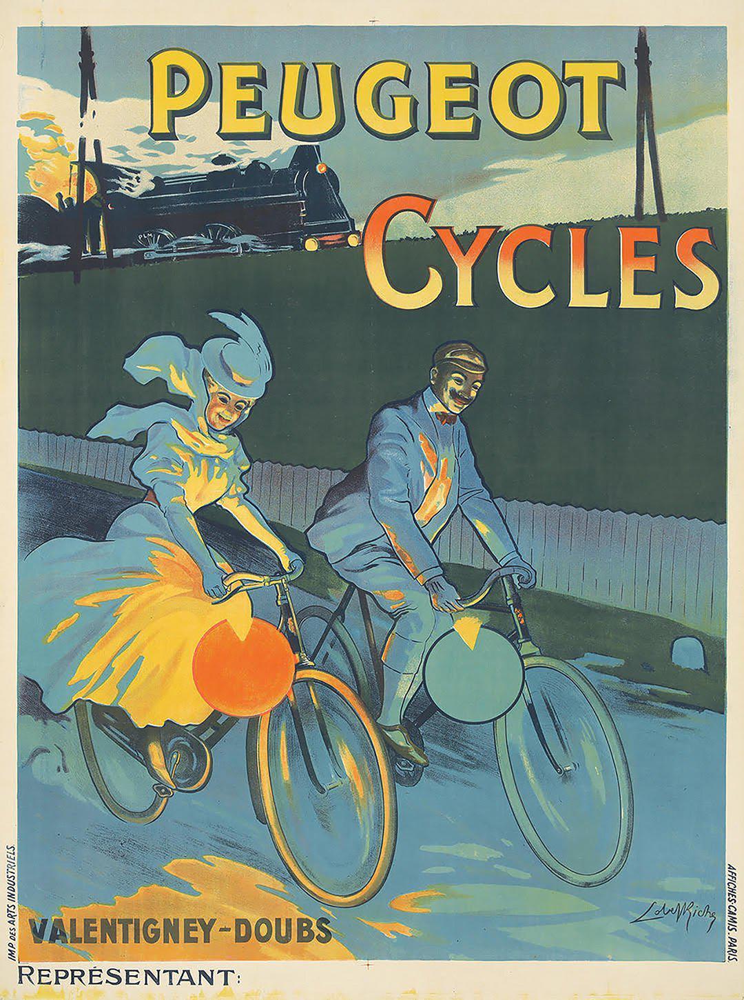 A couple chase the sunset on their Peugeot bicycles in this charming Belle Epoque poster by Almery Lobel-Riche. They outpace a steam train, which was considered the cutting edge in transportation at the time.