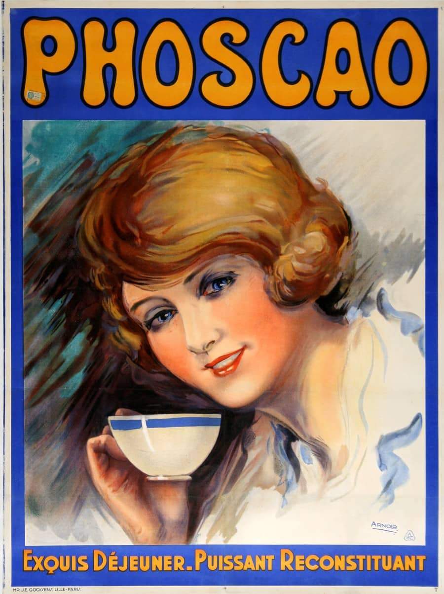 Phoscao was a very popular morning beverage drink made with cocao powder. In this image, the Anonymous artist, shows the fashionable lady with cup in hand enjoy her morning drink of Phoscao. The text on the bottom says that it is both a delicious breakfast and it gives you energy and revitalizes you. It is a delightful image for a morning beverage enjoyed by a fashionable woman.