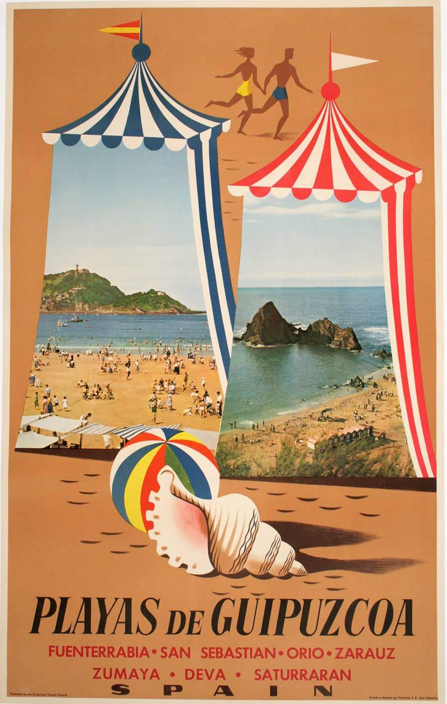 Guiouzcoa is a province in the Basque region of Spain. It is Spain's smallest province but also the area where the most speakers of the Basque language live. It is a region with many different beach destinations as we can see on the list of the towns on the lower part of the poster. Clearly, it is a place to have a good time. The poster was produced in the 1960's by an Anonymous artist for the province of Guipuzcoa.
