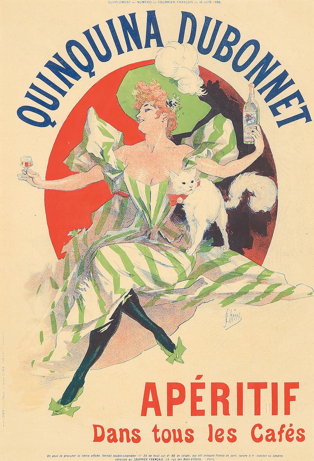 This charming poster for Dubonnet captures the lighthearted atmosphere of the French bar scene during the Belle Epoque. A stylish woman with a tiny waist gleefully sways with a glass and bottle of Quinquina Dubonnet in each hand. Her cat appears to partake in the revelry as well. This poster was printed in a larger size, as well as this size which was used as an advertising insert in French newspaper, Le Courrier Francais.