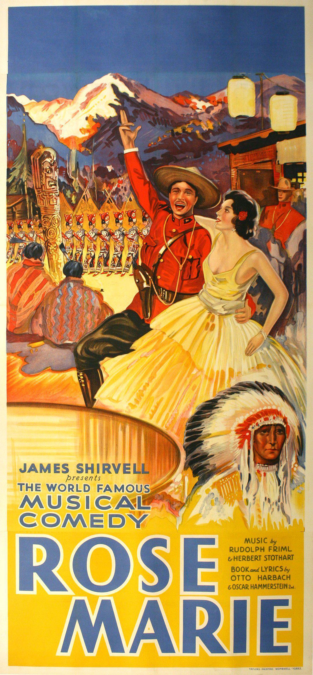 The magic of of the theater shines in this poster for the musical, Rose Marie. Originally performed in 1924 on Broadway, the show was a sensation and stayed on stage for 577 performances. It was the biggest hit of the early 1920s, and its songs became very popular with the general public. This poster was printed for the London production of the musical, which was staged in 1925.