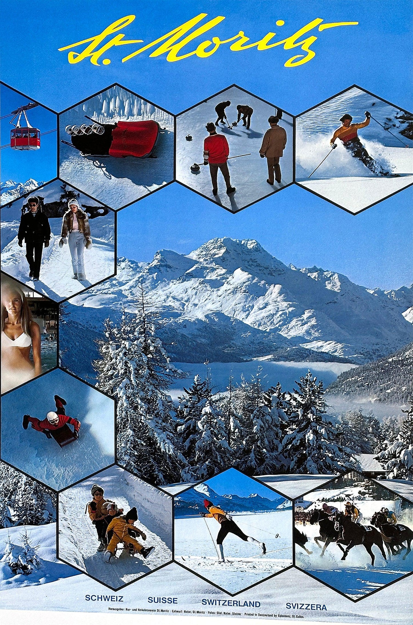 Many of us know St. Moritz for its skiing, but this poster shows us just how many different sports and activities there truly are in the area. From horseback riding to sledding and bobsledding, there clearly is something for everyone. The poster reminds us to think of St. Moritz as a year round destination.