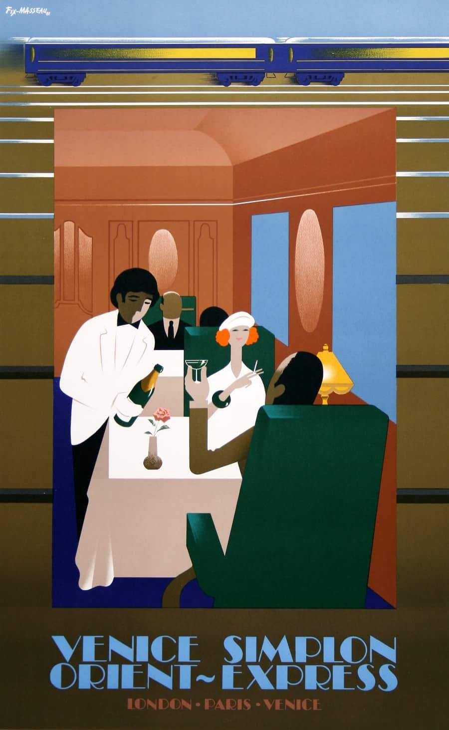 Venice Simplon - Waiter Pouring Wine is a 1982 French Travel poster by Fix Masseau (1905-1994) for the re-launch of the Venice Simplon Orient Express rail line. This poster highlights the elegance of the service in the dining car. The artist, Pierre Fix-Masseau uses his signature art deco style which he developed throughout his long career.