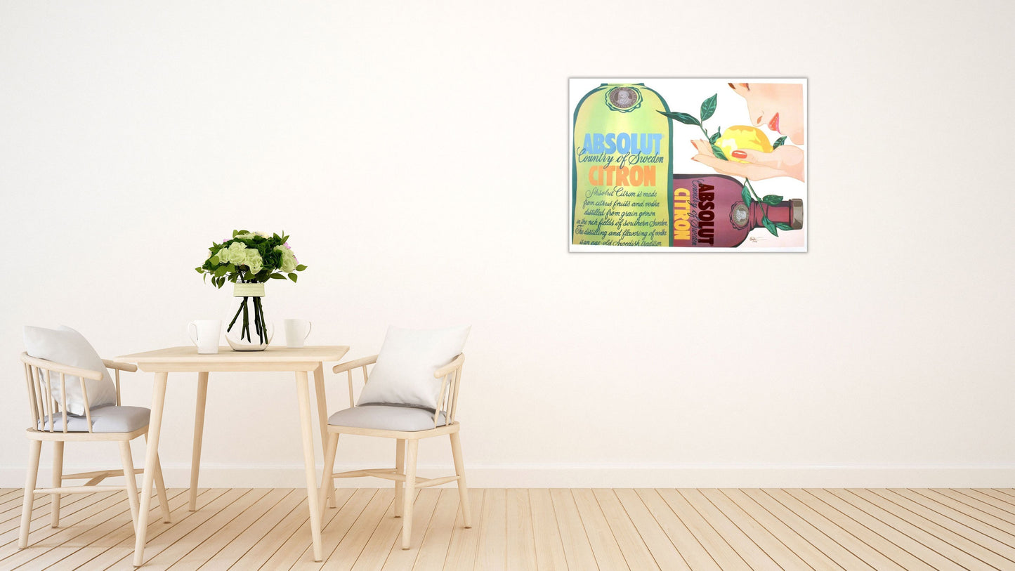 This poster advertises Absolut Citron which simply is a lemon-flavored Vodka. Paralleling with the beauty of the Absolut branding is the artistry of Clayton LeFevre. The contemporary painter uses a horizontal composition and features two brightly colored Absolut bottles with a female at righthand corner of the image, smelling a fresh lemon in anticipation of the citrus-infused drink.