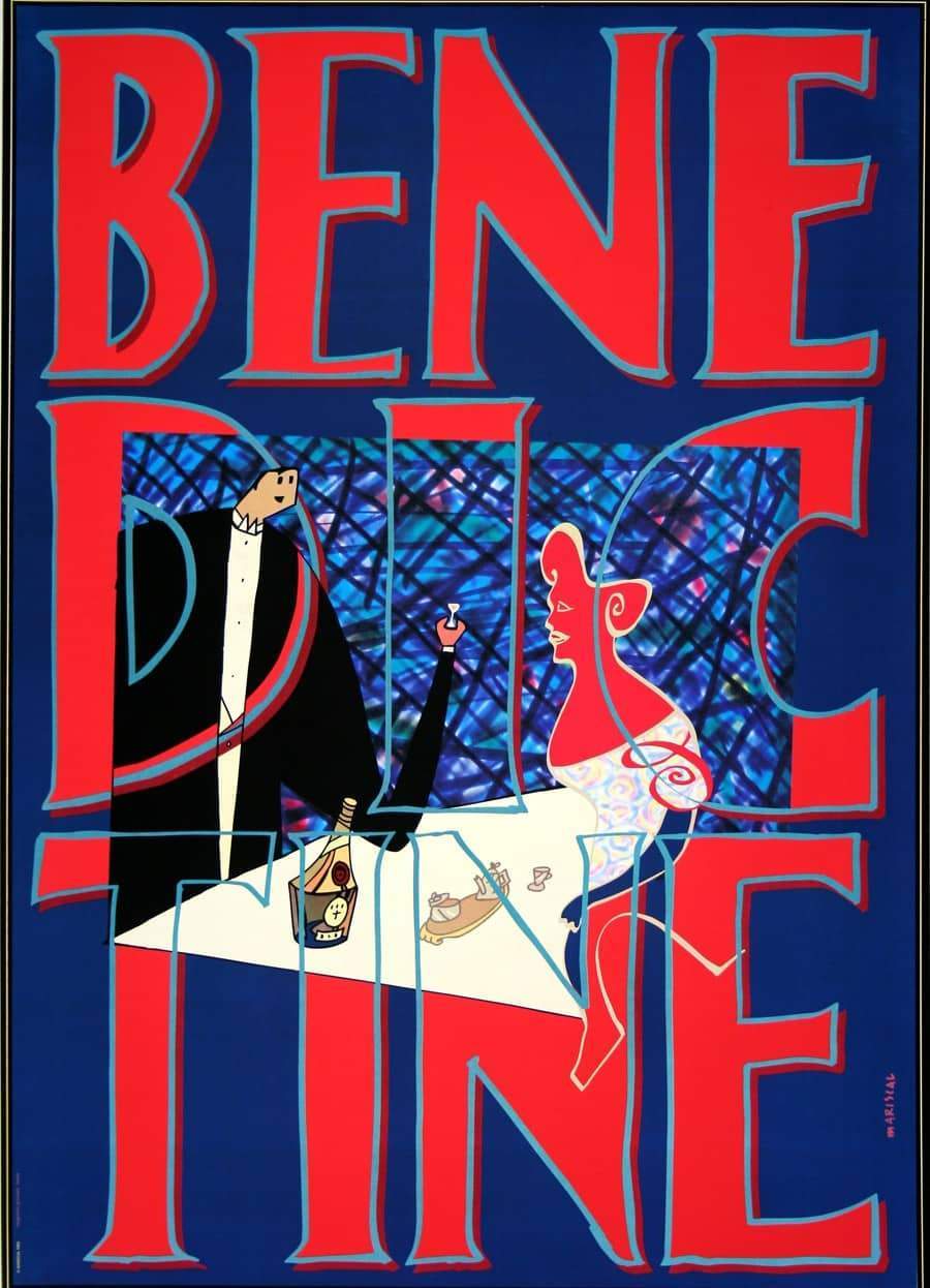 This original vintage poster was created in the 1990's by artist, Javier Mariscal. It is part of a campaign to promote the 200 year old Benedictine as a drink for the modern age.