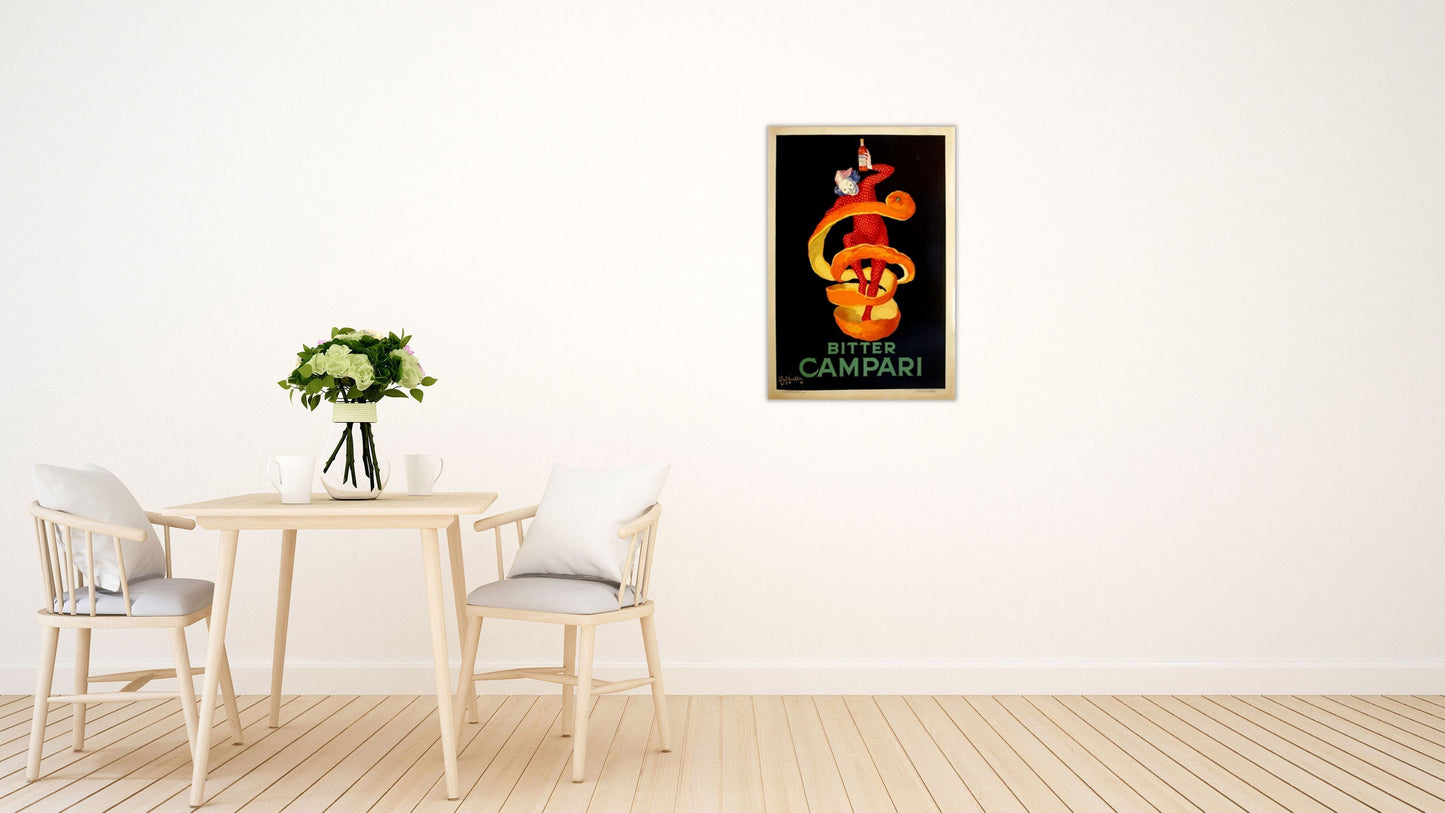 In 1904, Campari began to produce its liquor for overseas export. Advertising campaigns were developed to promote the brand. Of the many Campari poster created, this 1921 poster by Leonetto Cappiello is one of the most well-known images and is highly sought after by collectors. The poster was originally created in several sizes. This is the Medium version and it has been varnished and printed on heavy weight paper, likely for use outdoors.