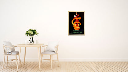 Bitter Campari is a French liquor advertisement from 1921 by the iconic poster artist, Leonetto Cappiello. This rare poster features Cappiello's signature style of a bright dynamic figure floating on a black background. The clown cleverly emerges from the orange as it is peeled, with Campari in hand.