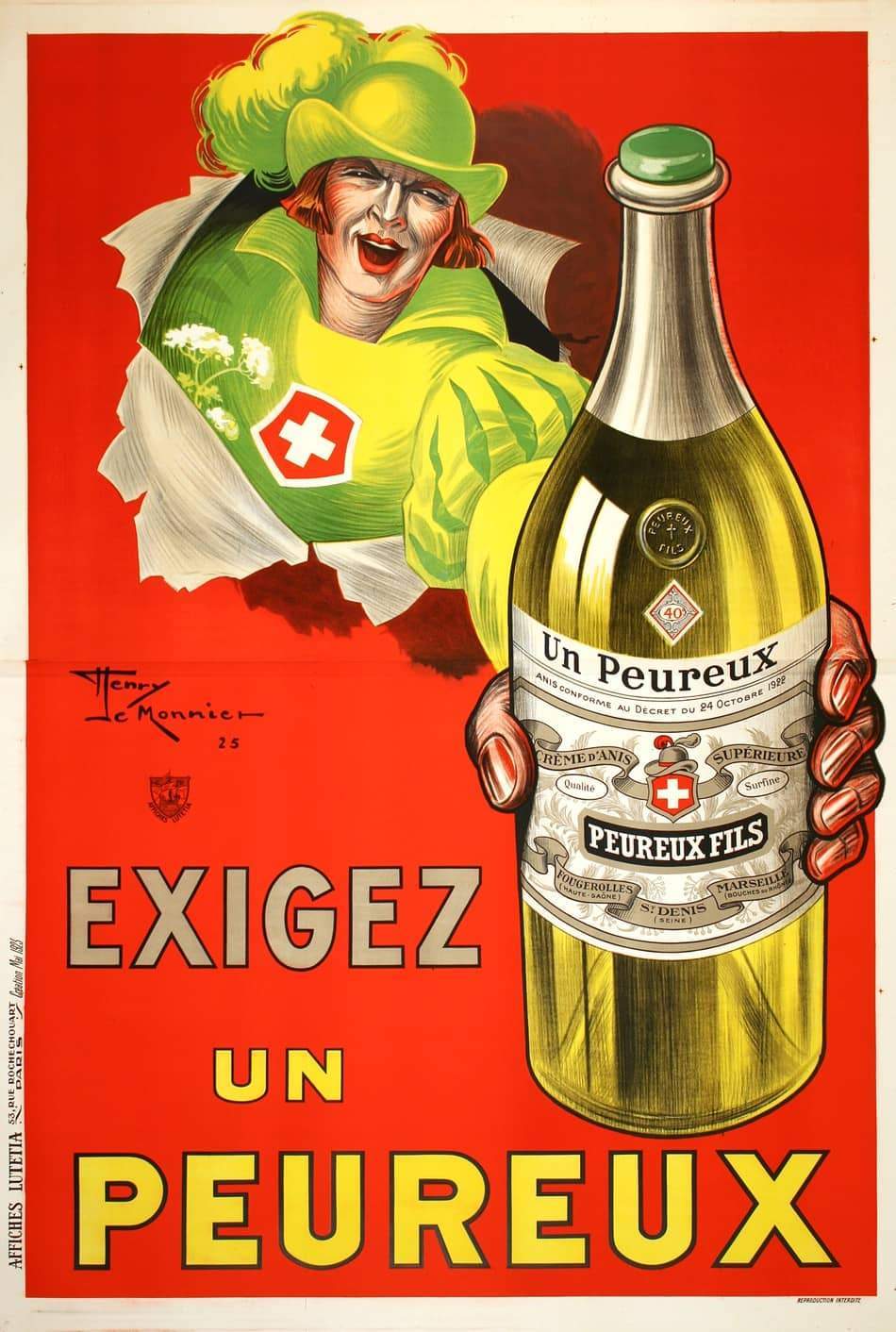 This is a very large and spectacular image for the French liqueur Peureux. The design was created by the poster artist Henri LeMonnier in the 1920. The poster was printed on 2 separate sheets and has been assembled as part of the linen backing process. It is a bold, colorful, and dramatic poster that is approximately 90 years old.