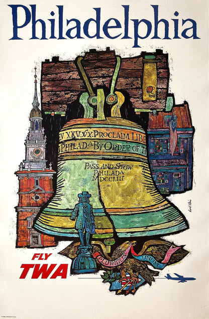 David Klein ( 1918-2005) was a noted poster designer whose body of work was prominent in the advertisements for TWA. In this 1960's design, we see the Liberty Bell which is the iconic visitors' site in Philadelphia. This poster was part of an extensive series by TWA to promote tourist travel in the late 1950's and early 1960's.