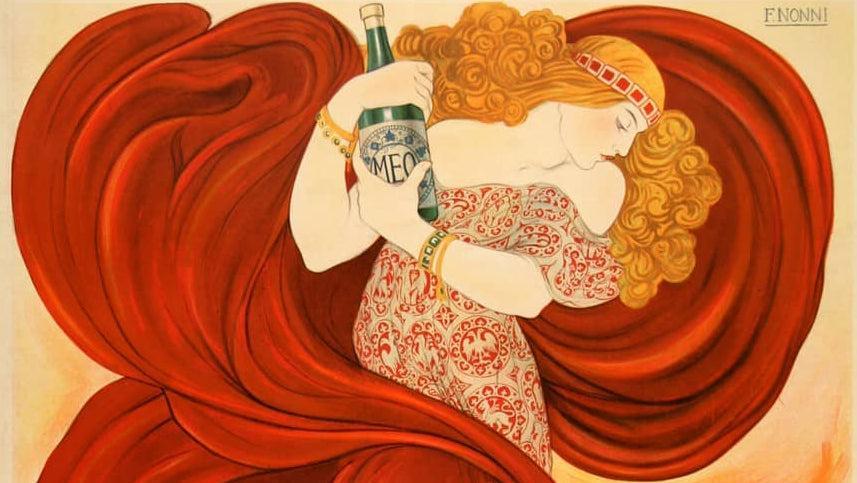 The Italian influence of style is clearly evident in this fine poster created circa 1910 by the artist, Nonni. He uses the influence of the Arts Nouveau of France but puts his unique style twist on it. The product is a mineral water but one presumably that appeals to the more elegant and fashionable of the population. The allure of this design is still strong, over 100 years after it was created. This is an Original Vintage Poster; it is not a reproduction. This poster is conservation mounted, linen backed, and in excellent condition. We guarantee the authenticity of all of our posters.