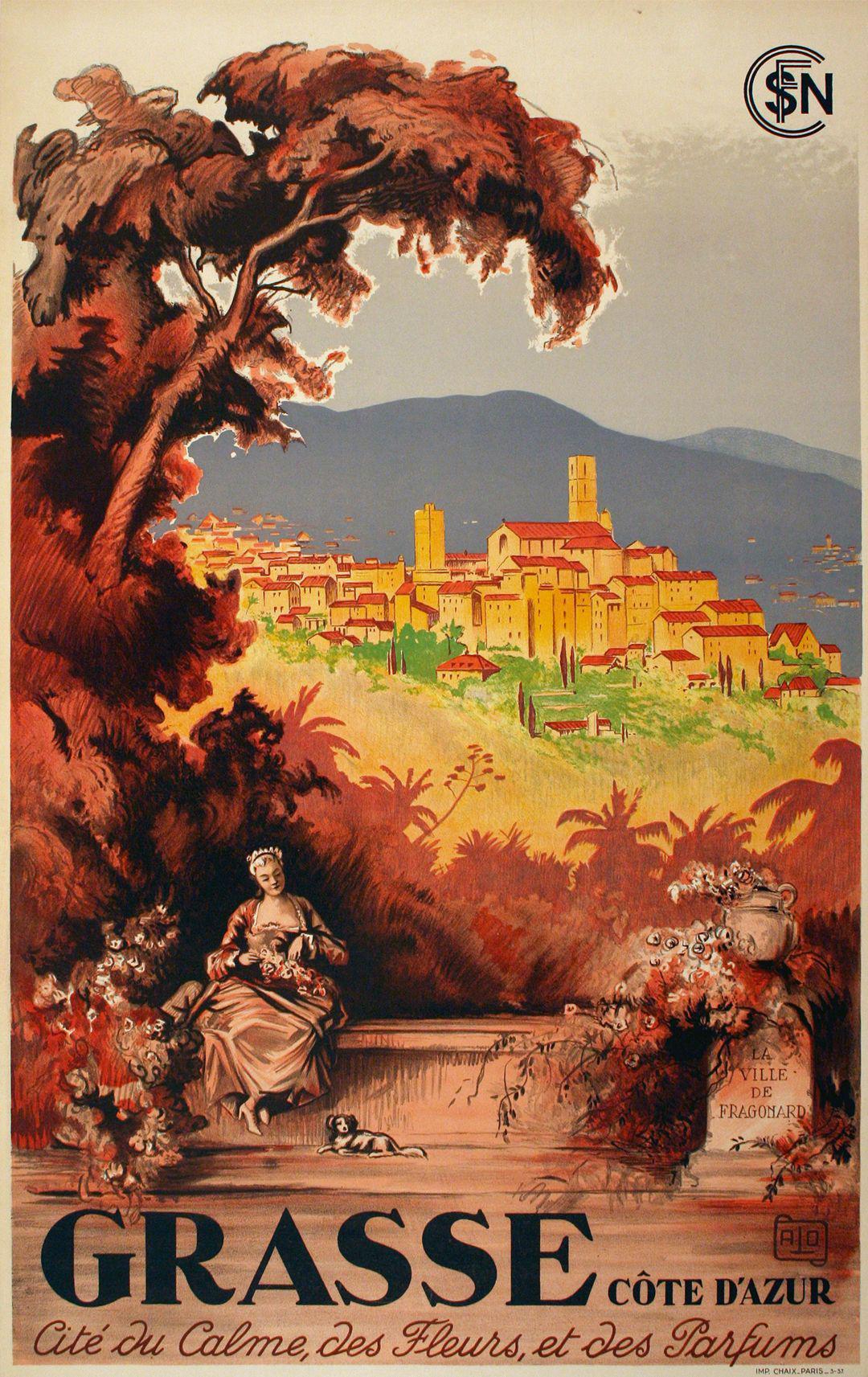 Grasse, the "Cite du Calme, Des Fleurs et Des Parfumes" (city of calm, flowers and perfumes) appears as a lush garden, where an elegantly dressed woman and her accompanying dog can be observed enjoying a book amongst the floral environment. In the background, the city of Grasse quaintly sits on a blue mountainside, beautifully depicting both the luxury and simplicity that the town has to offer. This French travel poster was sponsored by the Societe Nationale des Chemins de Fer (French National Railway company).