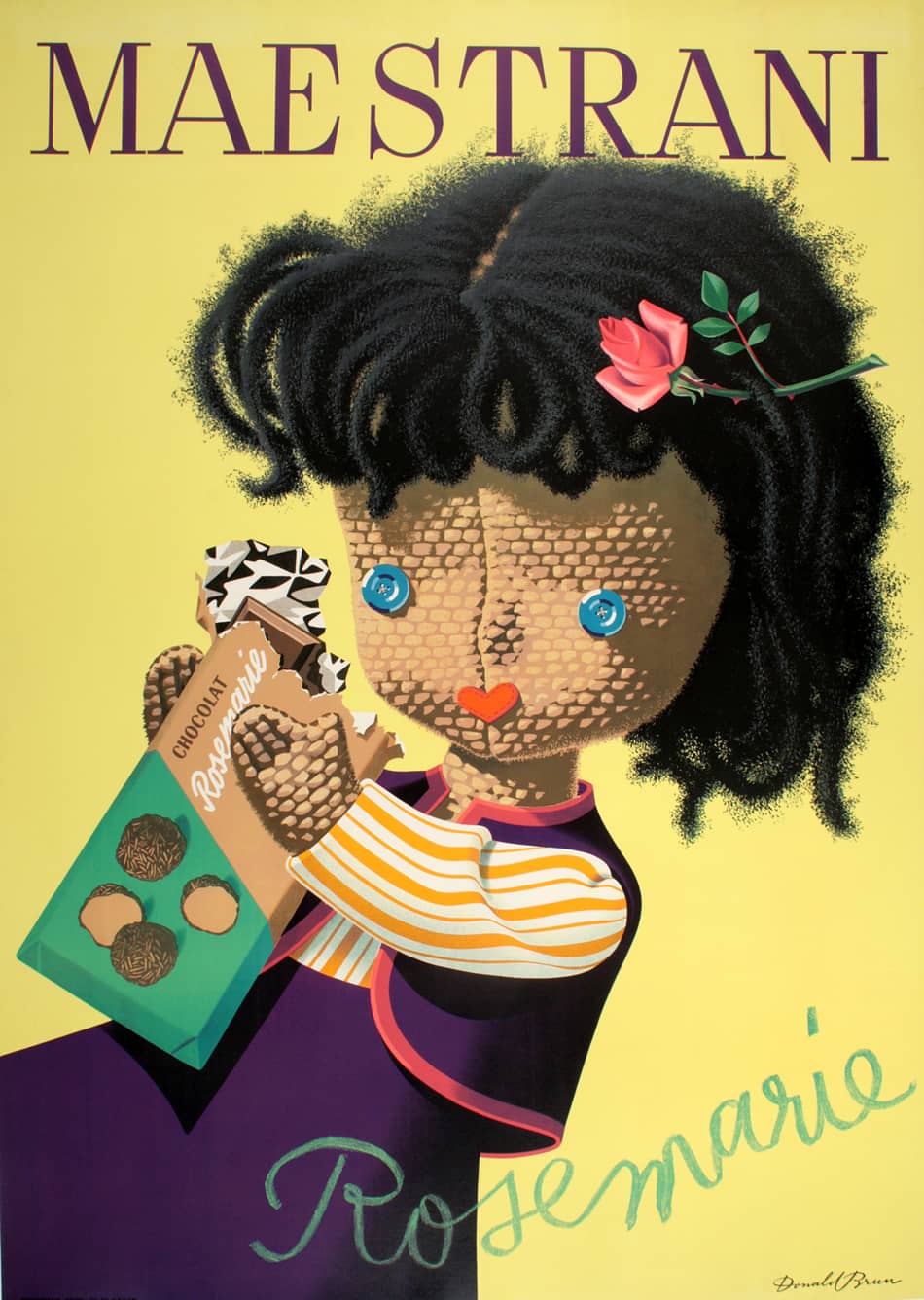 The Maestrani Company is a Swiss chocolate maker and the Rosemarie is one of their signature products. This charming poster was created by the well known artist Donald Brun in the 1950's to promote the product and the company. The image promotes the idea that the bar is of special appeal to children.