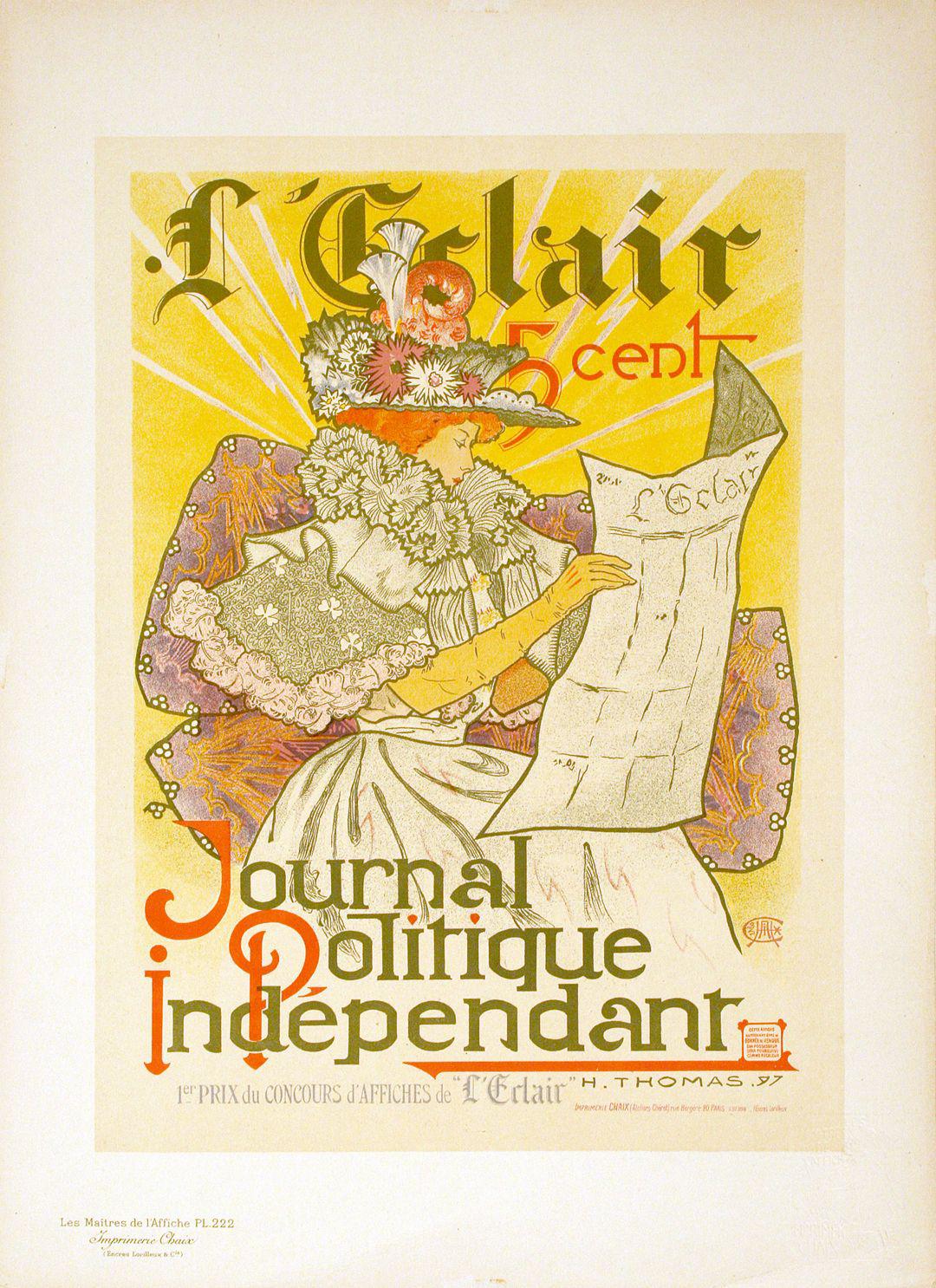 Founded in October 1888, L’éclair Journal Politique Independant was an independent French newspaper which focused on political press. This poster by Henry Atwell Thomas for the political publication was the winner out of 500 other submissions in one of the most successful poster competitions for the newspaper. In the image, we see an elegant woman, decorated in frill and flora, reading a L’Eclair newspaper. The background is bright and yellow, bursting out to the viewer to grab the newest edition.