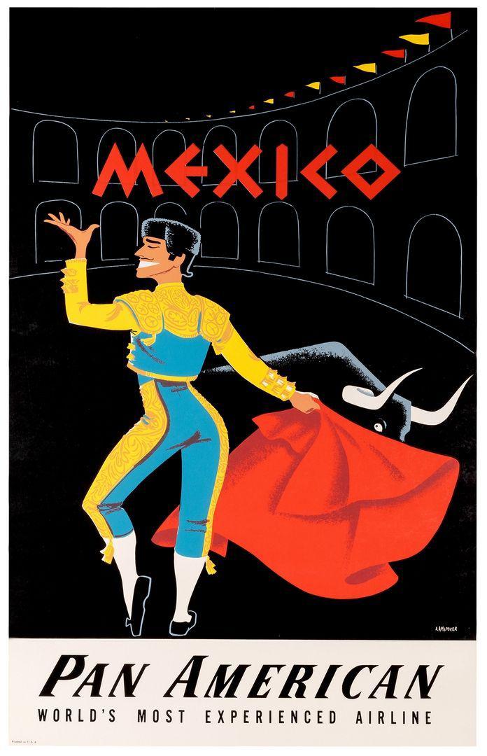 In this poster created by Aaron Amspoker, a Mexican bullfighter is posing in a heroic posture with a red cloth in hand while a strong black bull stands right next to him. Amspoker intentionally presents the arena in dark and brings all the light and color to the bullfighter, who is looking aside contemptuously. The bull is hidden in the dark but revealing its sharp horns and fixating its eye on its enemy. This vivid scene immediately triggers our curiosity: what is going to happen next? This poster was created to promote traveling to Mexico with Pan Am.