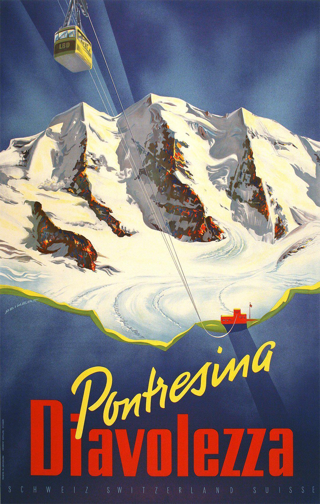 This poster is promoting the ski destination, Mount Diavolezza which is in the Pontresina region of Switzerland. The grand snow capped mountain stands tall and magnificent in the background. The mountain can be reached by cable car from Val Bernina, the Bernina Pass valley.