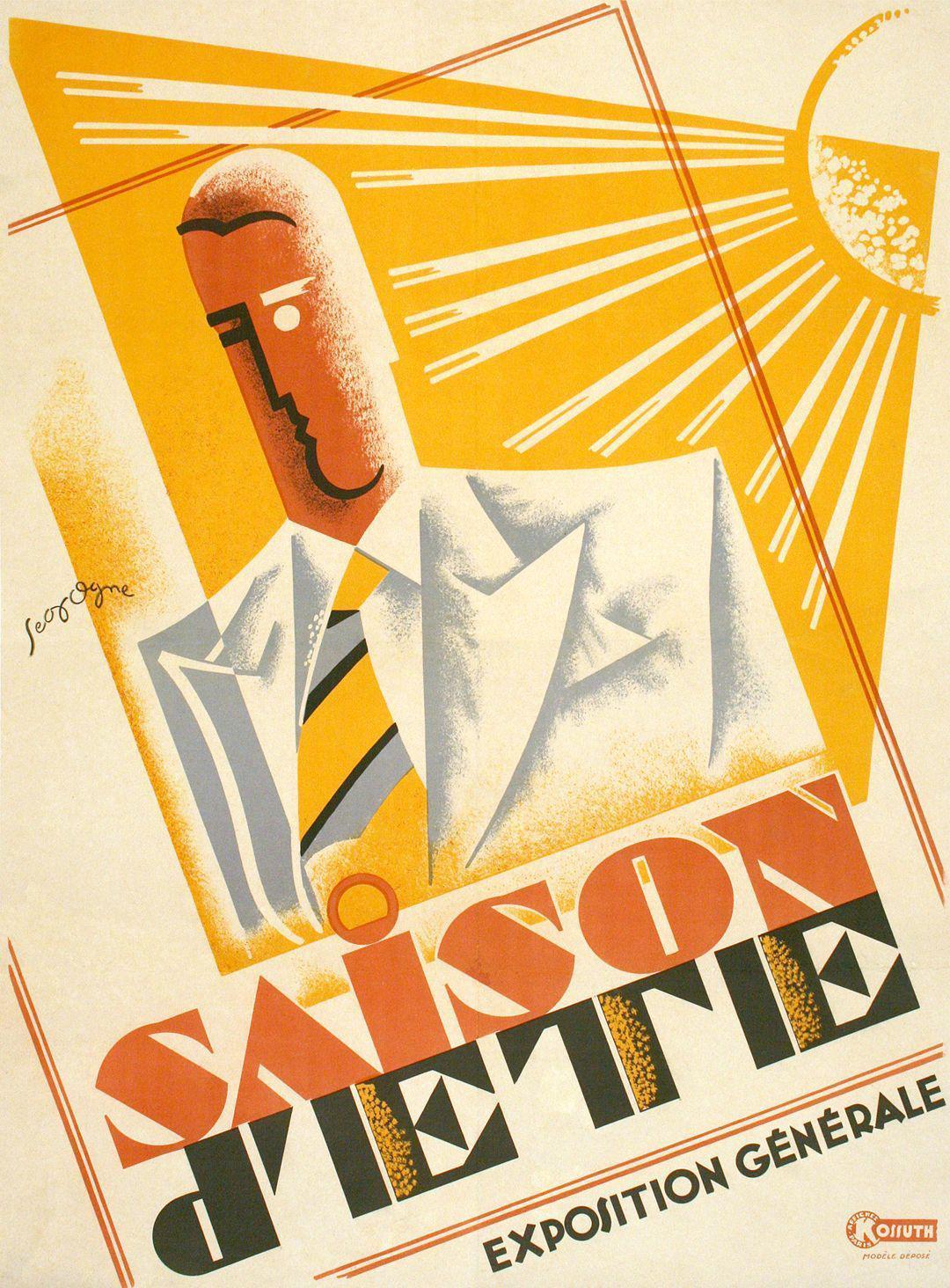 This poster, advertising the "Summer Season" at the General Exposition in Paris was created after 1930. It is a wonderful representation of the Art Deco style, which at the time was its prime in Europe and the United States. This modern poster features a vibrant combination of yellow, orange and brown hues, mirroring the hot temperatures of the summer season. The bold geometric forms of the Art Deco style can be observed in the poster through its asymmetric composition and strong rectangular forms.
