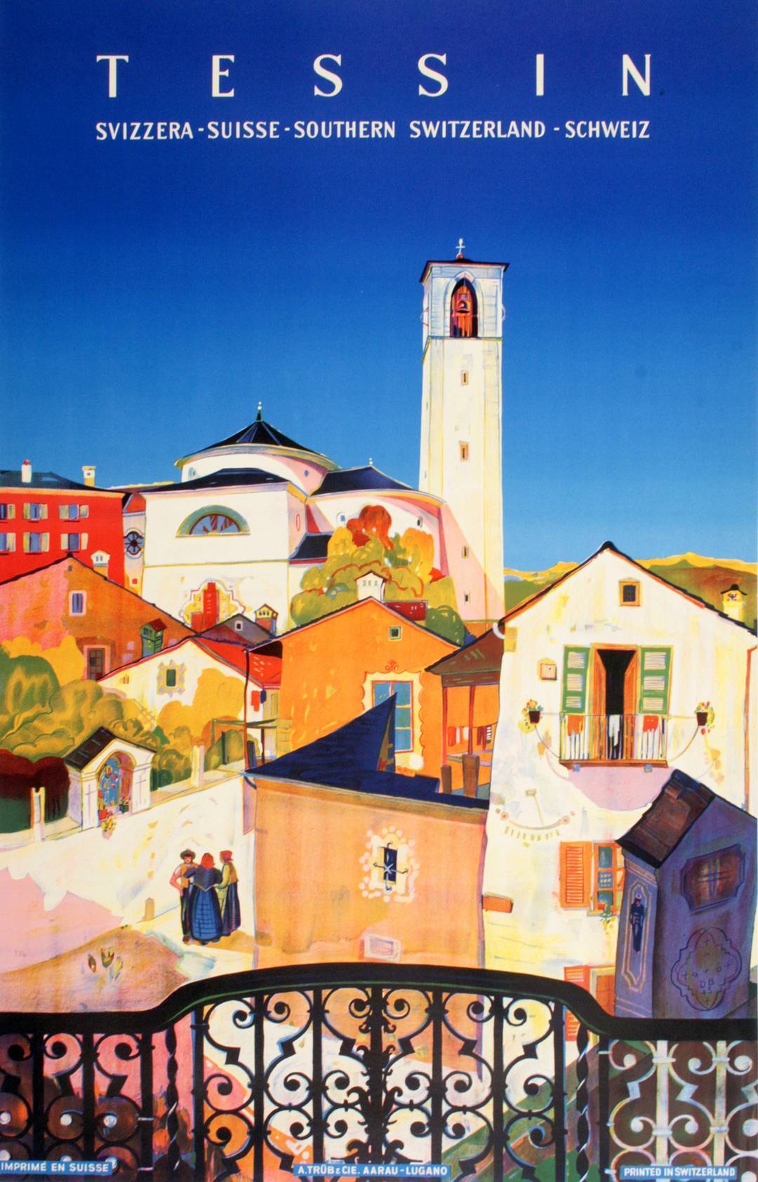 Tessin is a 1943 Swiss travel poster to the canton of Ticino created by Daniele Buzzi. Ticino is a region located in the south of Switzerland by the Ticino River that is made up of a large Italian speaking population. The largest city is Lugano. The area carries a German nickname of Sonnenstube or "sun porch" due to the regions more mild temperatures and longer hours of sunshine in comparison to the rest of the country.