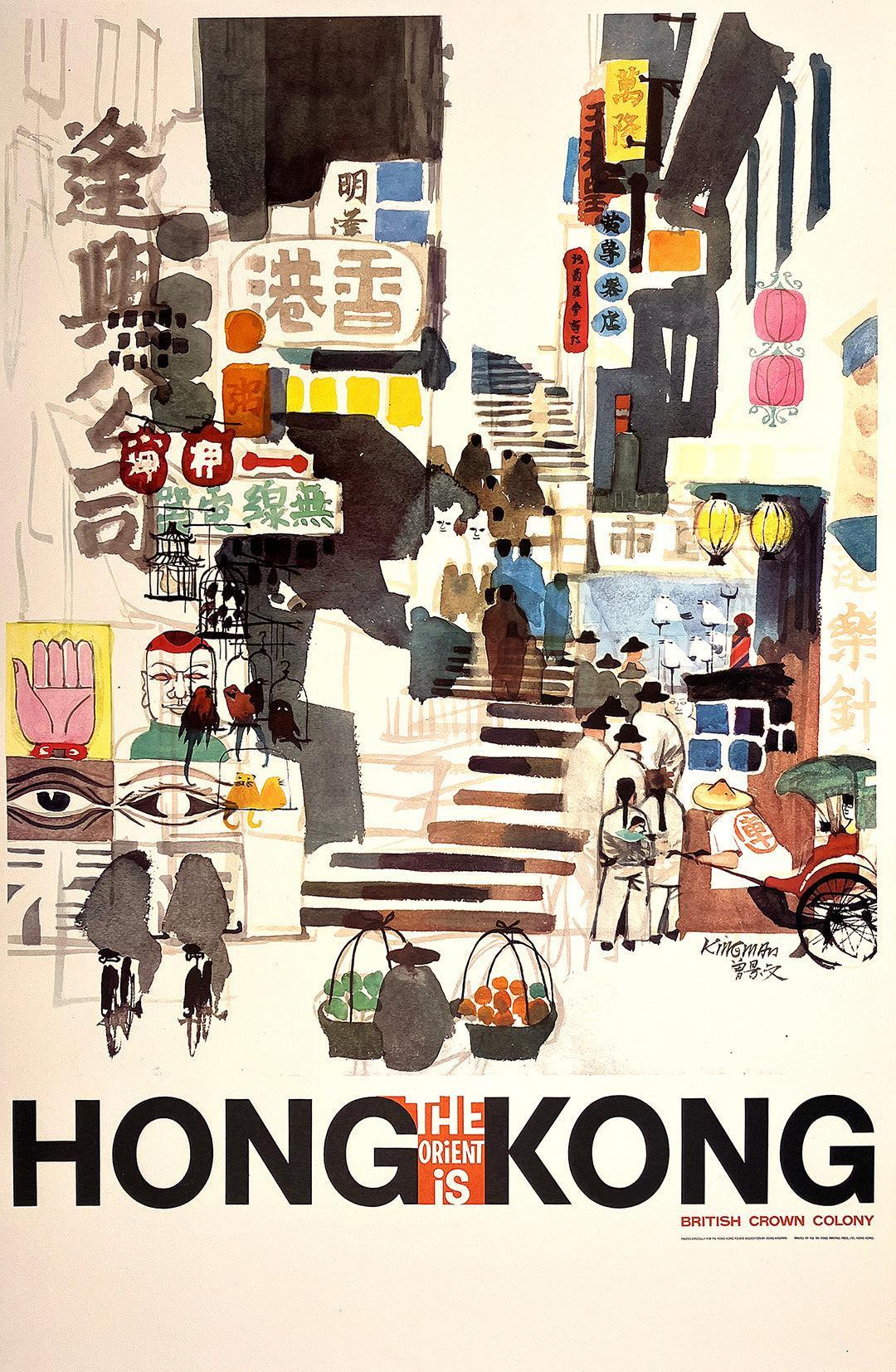 This original 1961 travel poster, titled "The Orient is Hong Kong – British Crown Colony," was created by renowned Chinese-American watercolorist Dong Kingman. Commissioned by the Hong Kong Tourist Association, it is the first in a series of four posters designed to promote Hong Kong as a vibrant travel destination.