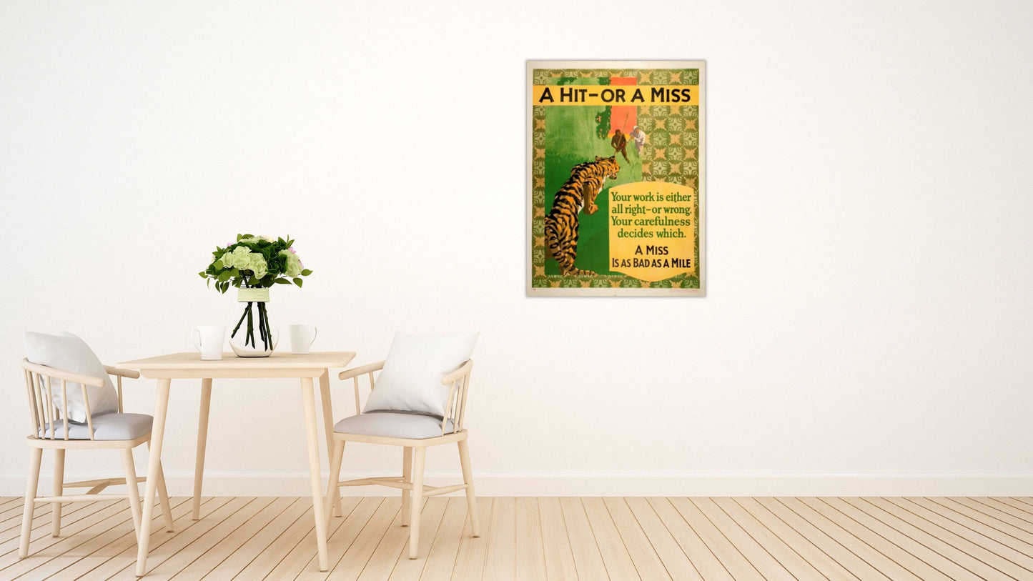 This is an original poster as printed in 1927 by Mather & Co. of Chicago as a work incentive poster. It is one of 78 posters created by Mather in 1927 and it symbolizes a special era in communicating and motivating domestic employees. They were intended to encourage productivity and performance. In this image by Willard Frederick Elmes, each worker is urged to be alert and accurate in their work efforts as errors are not acceptable.