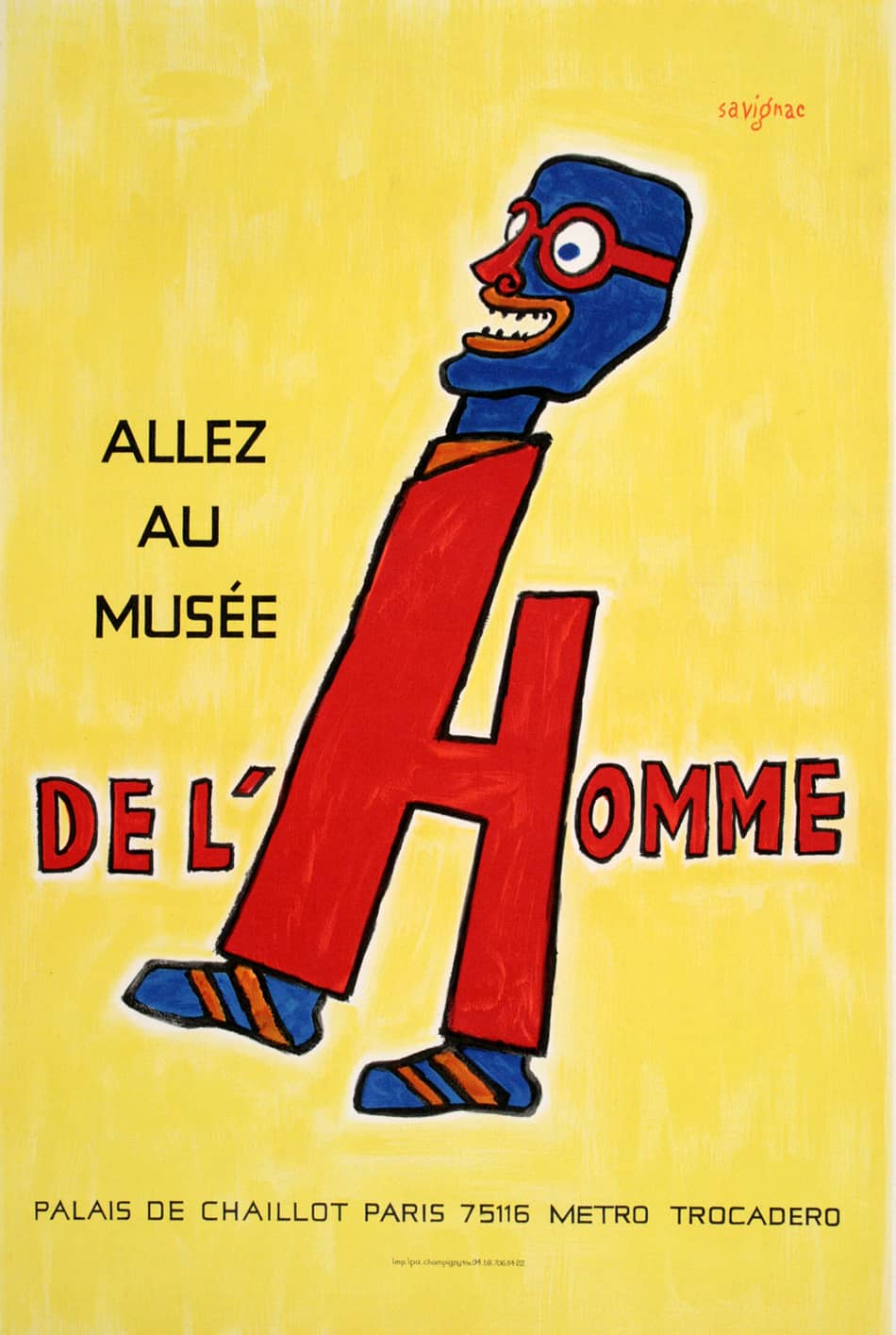 Raymond Savignac designed this poster for The Museum of Man in Paris in 1981, working a surrealist image of a man into the typography. Savignac was artistically self-taught and started his career working under the great Cassandre, but he developed a unique style all his own. His flat figures and lighthearted images were both charming and eye-catching, a perfect combination for advertising with mass appeal.