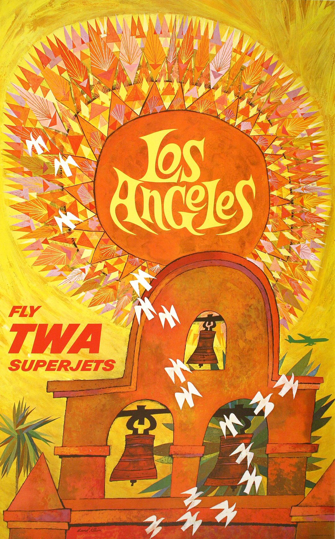 This Los Angeles poster was created circa 1959 by the gifted American artist David Klein (1918 -2005) for TWA. The image shows the 3 bell tower of The Church of Our Lady Queen of the Angels, also known as Plaza Church. The church was founded in 1814 by the Spanish next to the Los Angeles Plaza, which was the center of the city. The Plaza Church is a California historical landmark and one of the oldest landmarks in Los Angeles. Klein has depicted a very bright and geometrical sun that combined with the yellows and oranges of the overall image, gives the viewer a feel of warmth and heat.