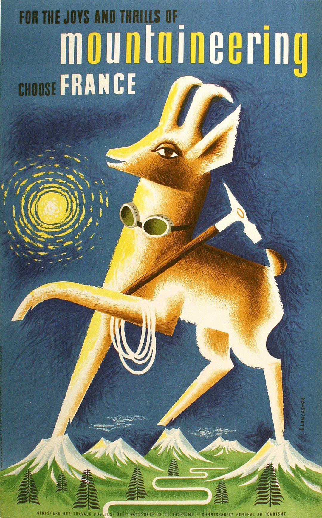 This poster advertises the fun of mountaineering in the beautiful country of France. Mountaineering is also referred to as mountain climbing, or alpinism. The French Alps are known as the birthplace of modern mountaineering, offering tourists and locals the opportunities to climb the famous Mt. Blanc - Europe’s highest peak, Mt. Chamonix, Montagne Sainte Victoire, and Tour Ronde.