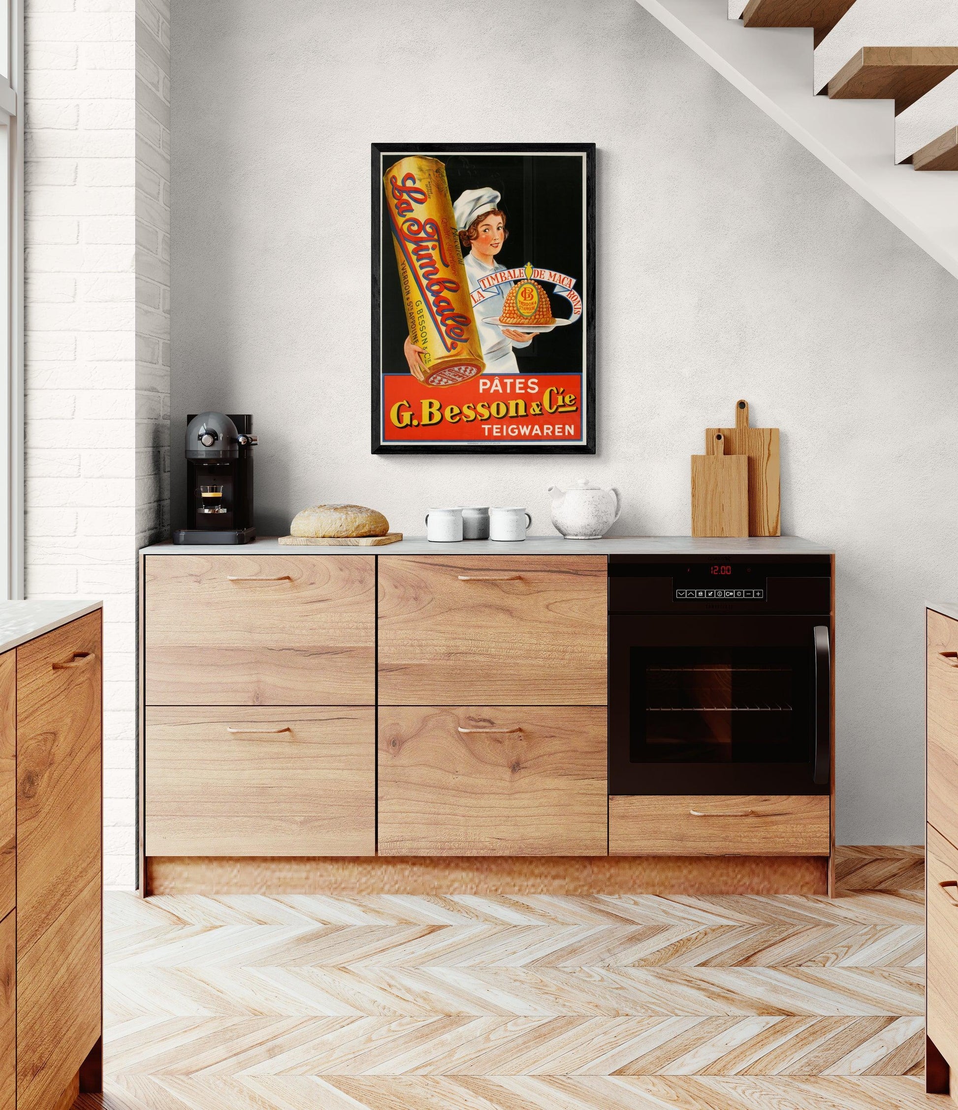 La Timbale is a c.1930 French food advertisement by an anonymous artist for G. Besson and Company. This classic image was done in the popular advertising style of that period. The artwork demonstrates how the macaronis can hold their shape in the structure of a bell for use in French dining presentation.