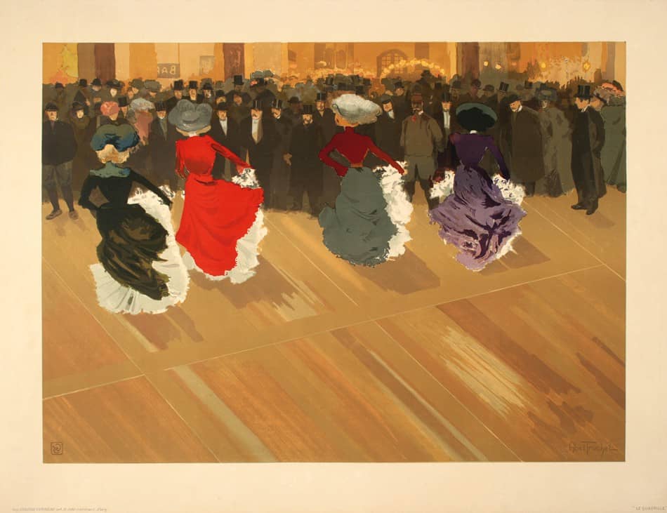 "This is a decorative panel . . . with an interesting view of the cancan from the rear. From this vantage all we get is a hint of the swirl of white petticoats, yet it is enough to communicate the zest and energy of this French specialty. The title given to the artwork goes back to the name of the original dance for four couples from which the cancan evolved . . . Truchet was primarily a painter, but he also mastered the techniques of illustration, etching, and lithography and produced a few posters of undoubted merit" (Gold, p. 139).