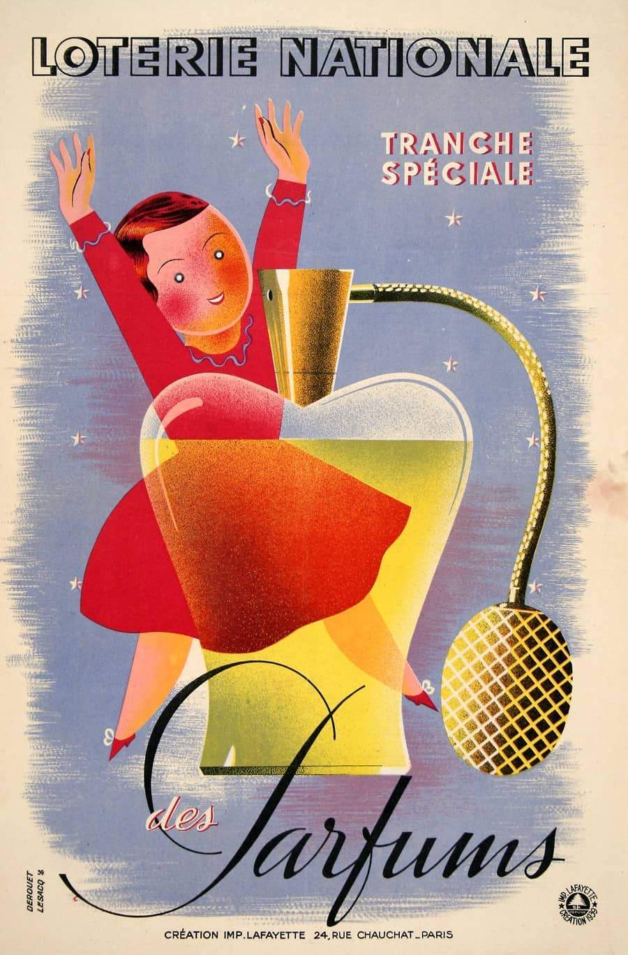 This colorful, Art Deco style poster is for a special drawing of the lottery. The theme of this lottery drawing is perfume. The image shows a woman jumping for joy over her massive bottle of perfume.