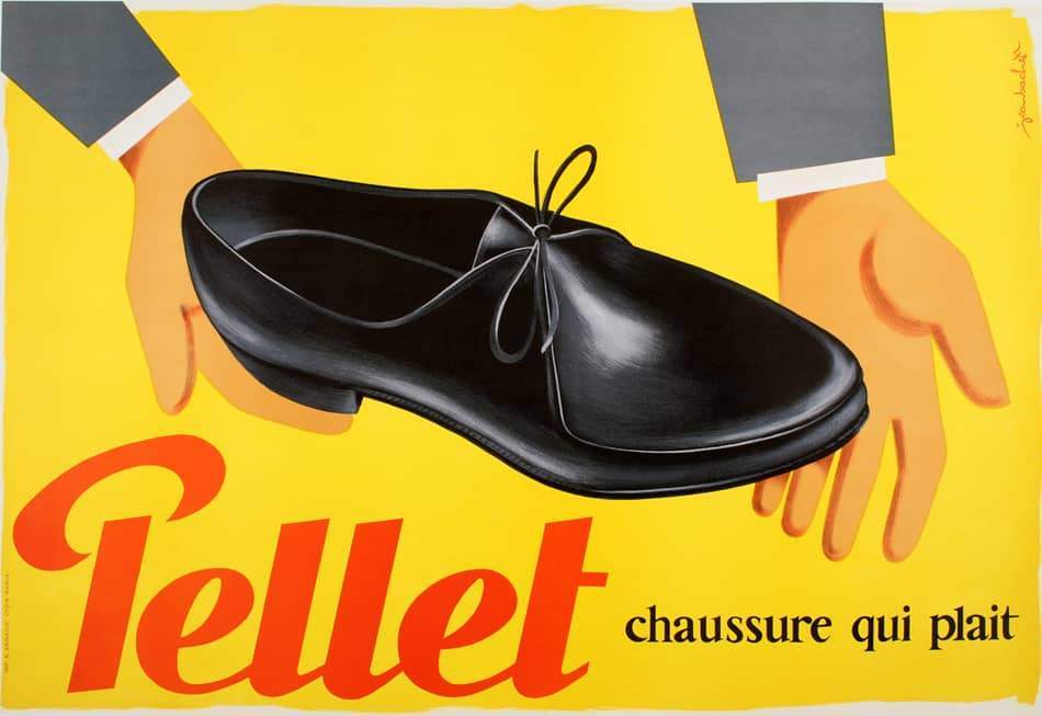 This is a clean mid century design for the Pellet Shoe company that makes "shoes that please." The artist, Bachet, conveys the clean lines of the shoe very well.