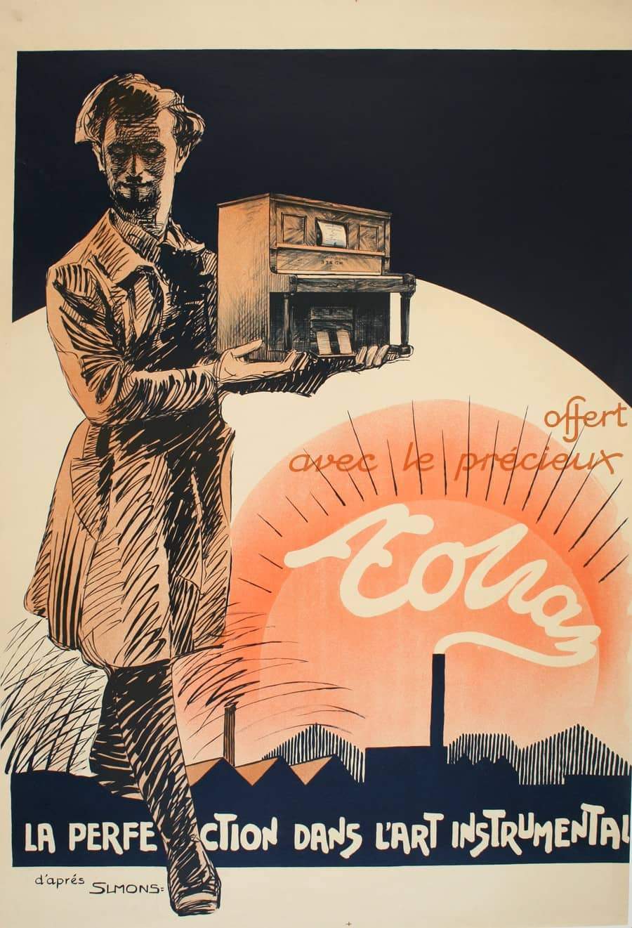 This vintage poster from 1920 advertised pianos. The artist uses a portrait of the proprietor as a giant, tenderly holding one of his pianos. The figure is drawn so that it looks like he is walking off the poster toward you which, along with the rising sun, is designed to catch the viewer's eye. The bottom of the poster describes it as perfection in the instrumental arts.
