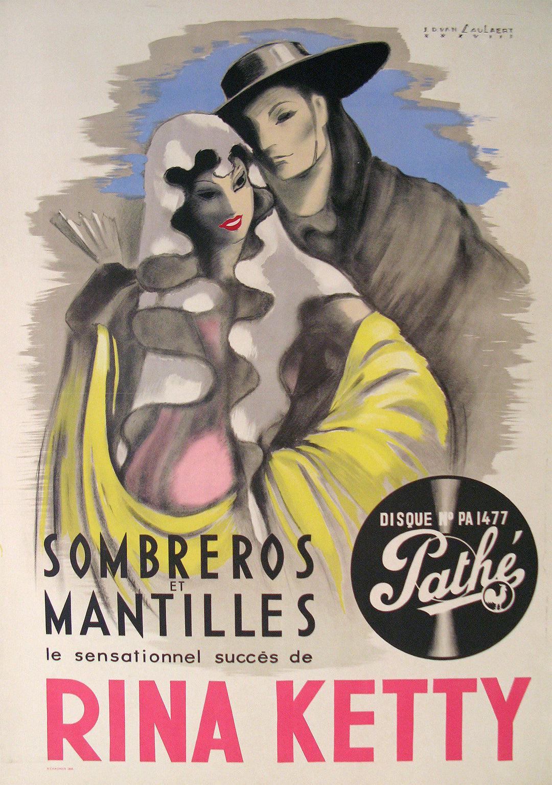 Rina Ketty (1911-1996) was a superstar in 1930s and 1940s France. This poster was created to promote her latest single with Pathe, "Sombreros et Mantilles". Ketty rose to fame in the years leading up to the outbreak of WWII, when many European countries took influence and inspiration from one another. "Sombreros et Mantilles" was a love ballad about a French woman who leaves her lover in Spain, and it borrows heavily from flamenco beats.