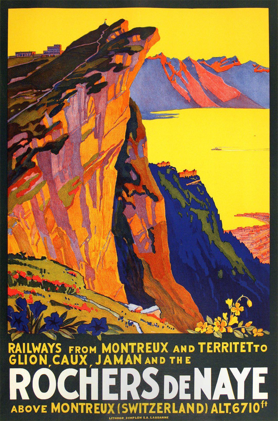 In this image by Emil Muller, we see the beauty of a mountain at twilight, surrounded in warm hues of yellow, pink and indigo. The views of the lake below only further the sense of tranquility one gets from being in this locale. This beautiful imagery was designed to allure visitors to the region via the Swiss rail lines.