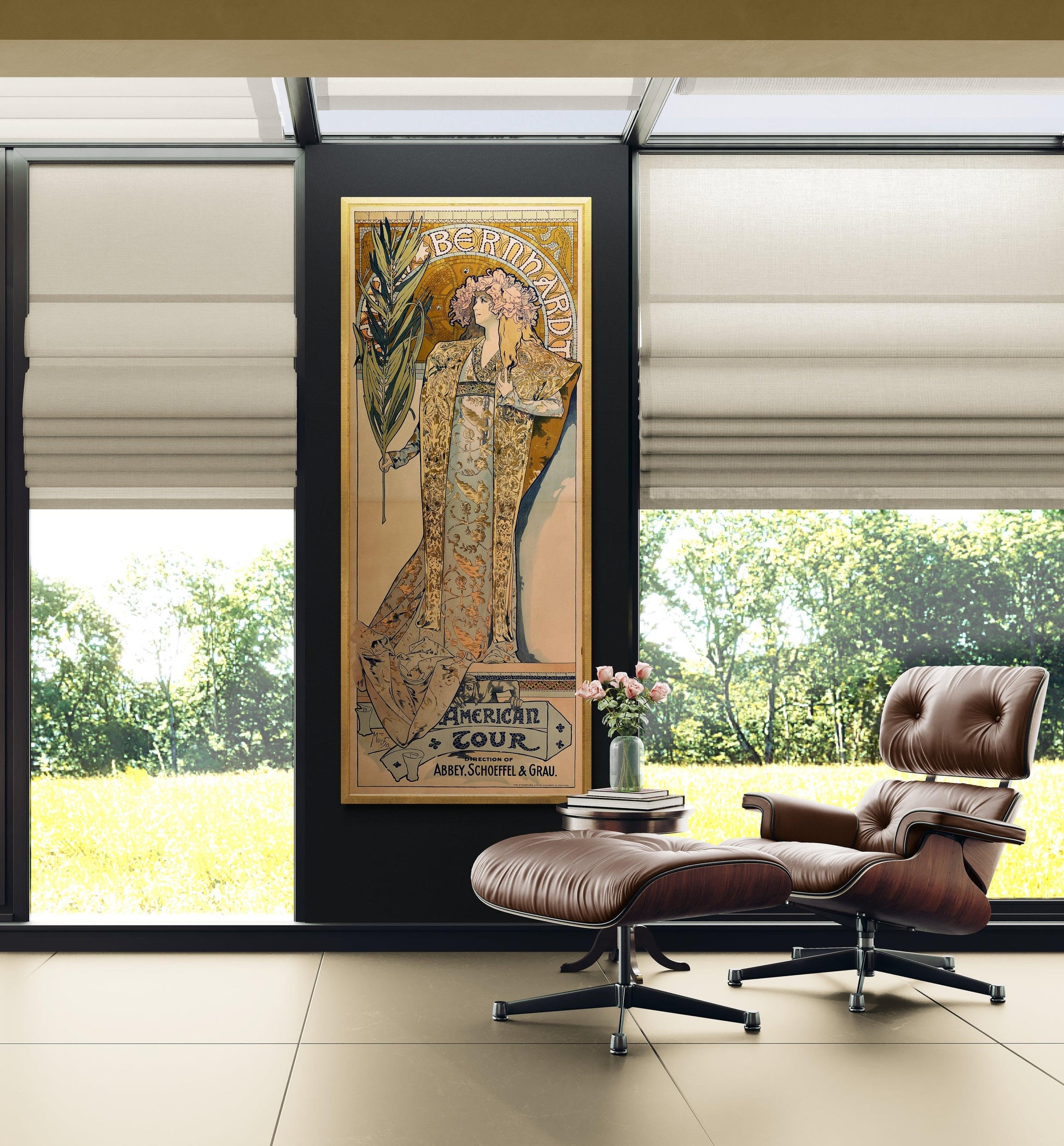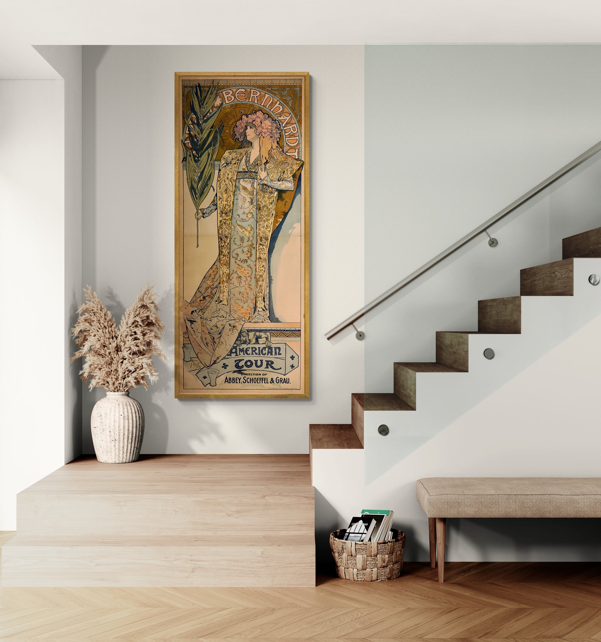 This elegant lithograph by Alphonse Mucha (1860–1939) was created to promote Sarah Bernhardt’s American Tour, presented by Abbey, Schoeffel & Grau. The design epitomizes Mucha’s style—flowing lines, elaborate patterns, and a statuesque figure framed within an ornate architectural setting. Bernhardt, draped in a richly patterned robe and crowned with voluminous hair, is rendered with a sense of grace and divine presence that elevated her image into legend.Alphonse Mucha, born in Moravia and later active in Paris, is one of the most influential figures in poster history. His work defined the Art Nouveau style in the 1890s, often called “Le Style Mucha,” with its sinuous curves, decorative motifs, and ethereal female figures. His breakthrough came in 1894 when Bernhardt commissioned him to create the poster for her play Gismonda. Its enormous success not only cemented his career but also transformed the very nature of poster art, raising it from ephemeral advertisement to a celebrated form of fine art. Mucha’s posters became icons of Belle Époque Paris, influencing generations of graphic design and cementing his place as one of the most important poster artists of all time.This poster for Bernhardt’s American Tour is a striking example of Mucha’s mastery of composition and ornamentation, merging commercial purpose with artistic beauty. It captures the height of the collaboration between Mucha and Bernhardt, a partnership that produced some of the most celebrated posters of the era.This is an Original Vintage Poster, it is not a reproduction. This poster is conservation mounted, linen backed and in excellent condition. We guarantee the authenticity of all our posters.
