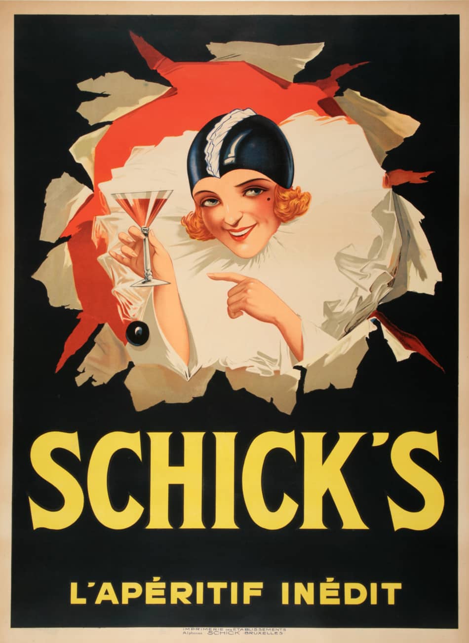 This clever image shows a most stylish young woman bursting through the sheet of the poster while gently holding a martini style glass holding her new aperitif made by the Schick's Company of Belgium. This image was created at the height of the flapper girl look and this poster uses the style of the era to advertise the Schick's product. This is an Original Vintage Poster; it is not a reproduction.