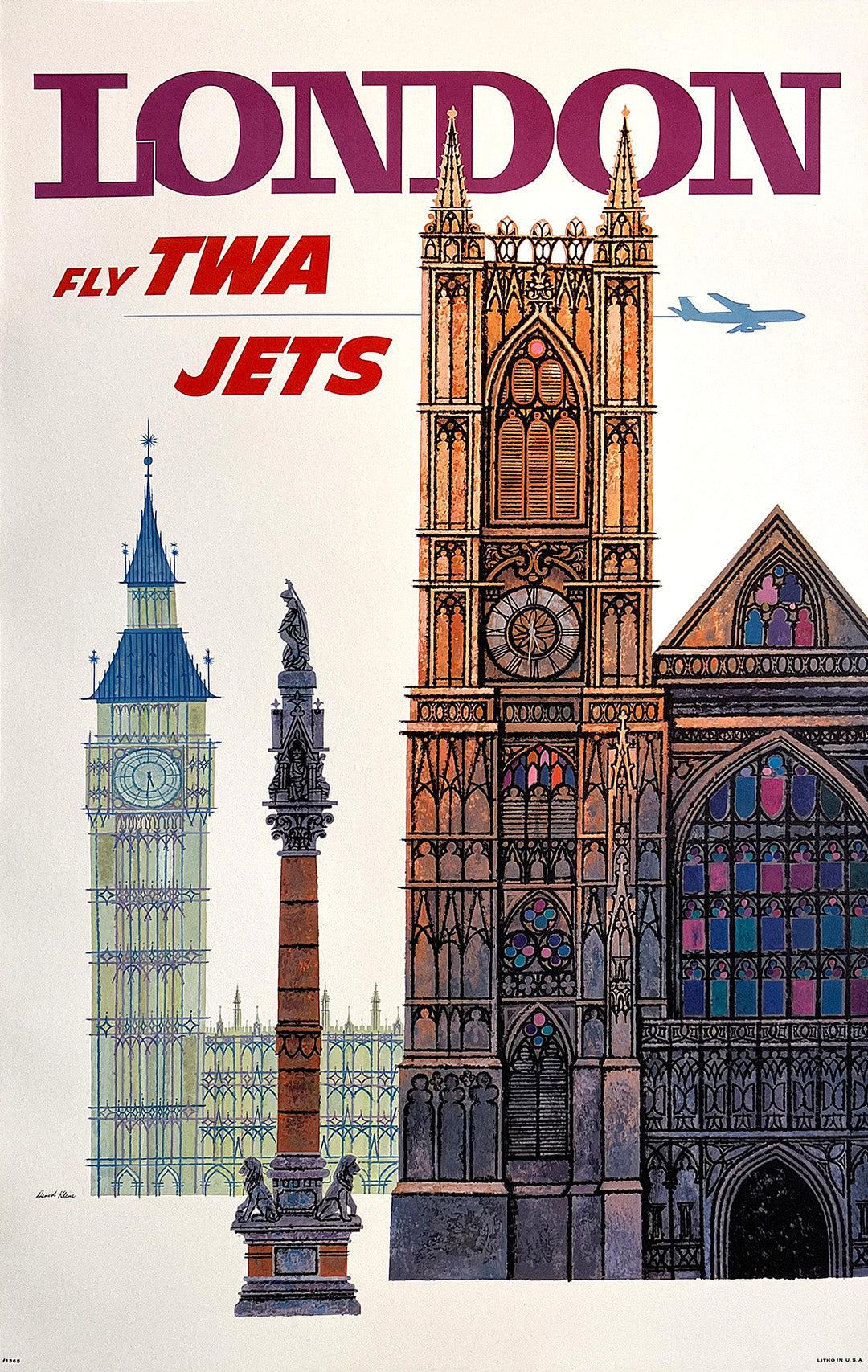 David Klein was a noted poster designer whose body of work was prominent in the advertisements for TWA. In this 1950'S design, we see some of the sites to be visited in London, including Big Ben and the Houses of Parliament. This poster was part of an extensive series by TWA to promote tourist travel in the late 1950's and early 1960's.